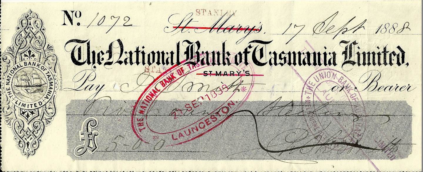 This cheque shows how often banking instrument like this was shared. The town here has been altered from St Marys to Stanley.