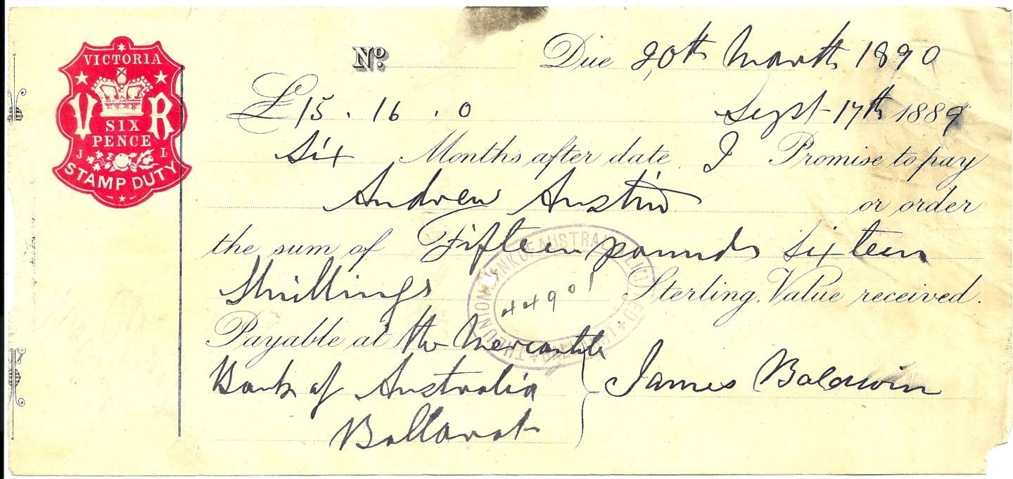 Issued by the Mercantile Bank of Australia it is a postdated check for payment 6 months later to one Andrew Austin from one James Baldwin for the sum of 15 pounds and 16 shillings.