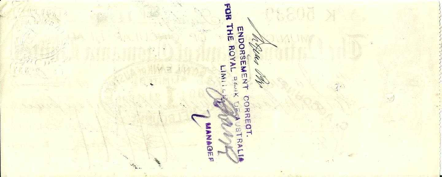 At over 100 years old it is a lovely piece of Australian history and is in good condition for its age. The cheque is for the sum of 8 Pounds and 12 Shillings and 6 pence Sterling. Counter stamped by the Royal Bank of Australia.