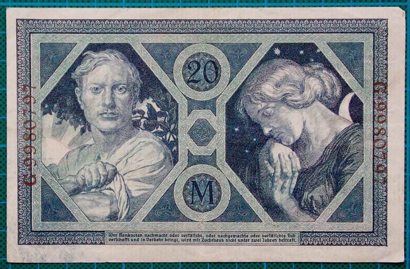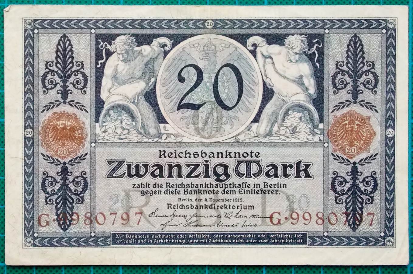 Here on offer is an average grade example from this World War I treasury note for 20 Mark.Â