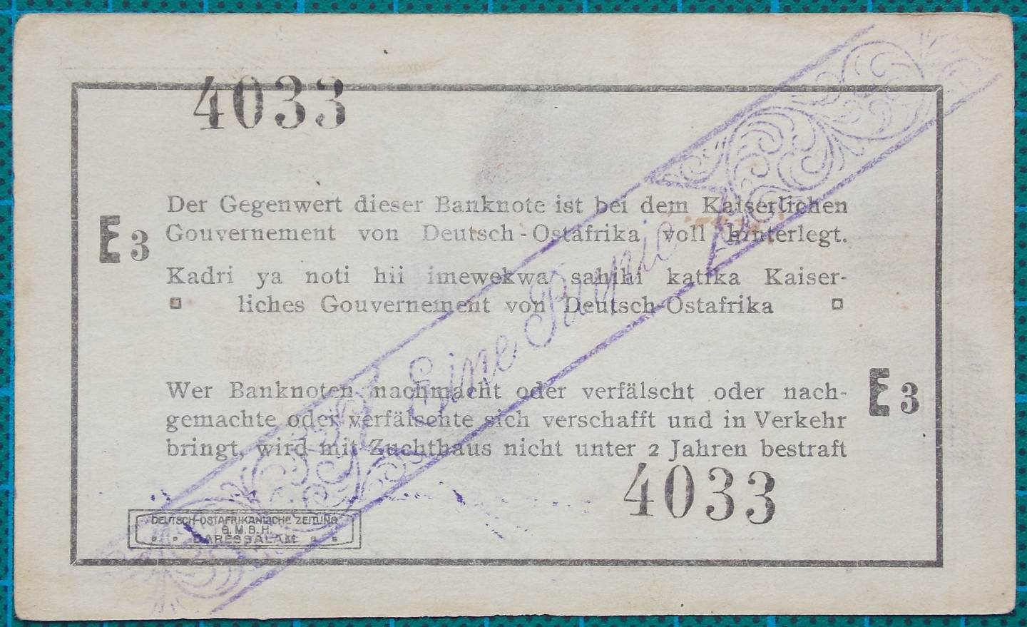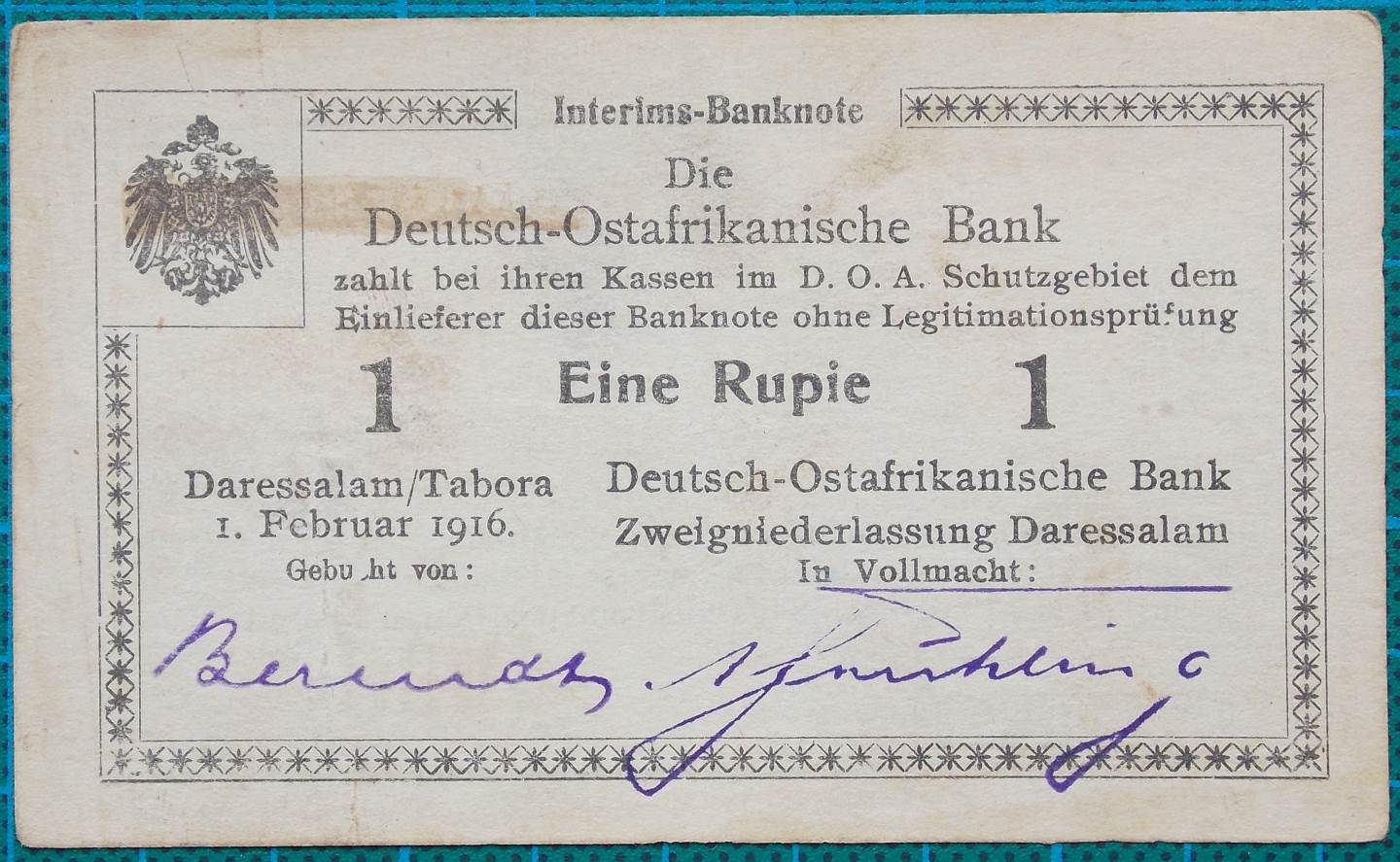 The Deutsch-Ostafrikanische Bank or German East Africa Bank issued this One Rupie banknote in 1916.