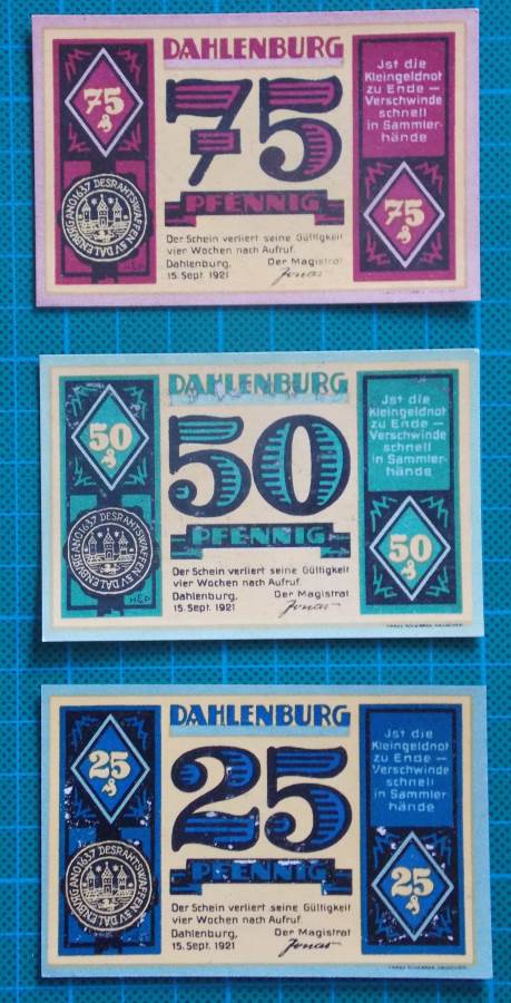 This 3 banknote set issued in 1921 during the hyperinflationary period in Dahlenburg have been wonderfully preserved.