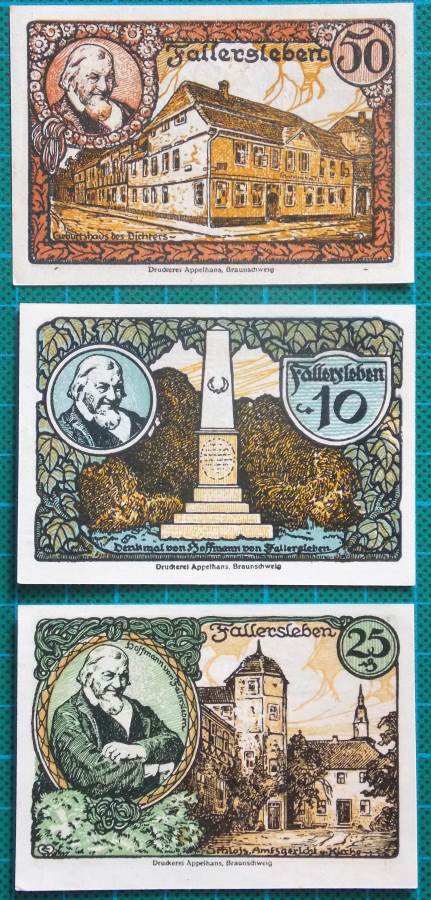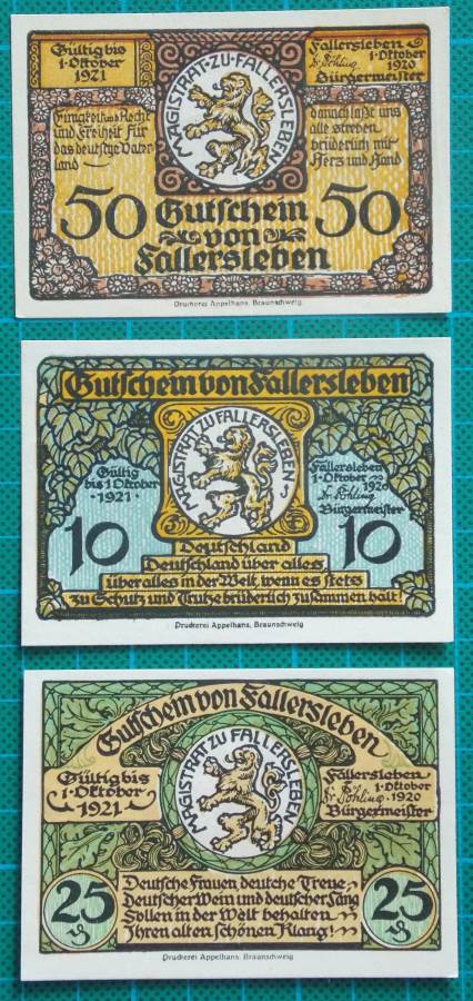 Another lovely set of beautifully kept 1921 notgeld banknotes from Fallersleben in Germany.