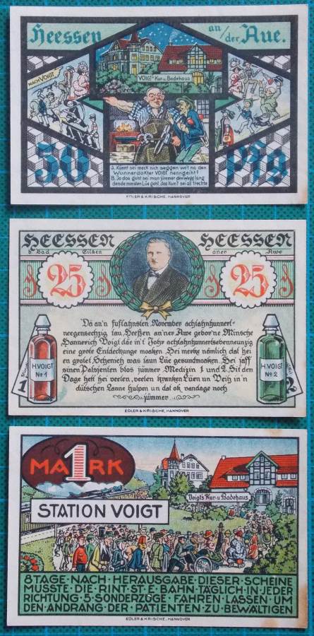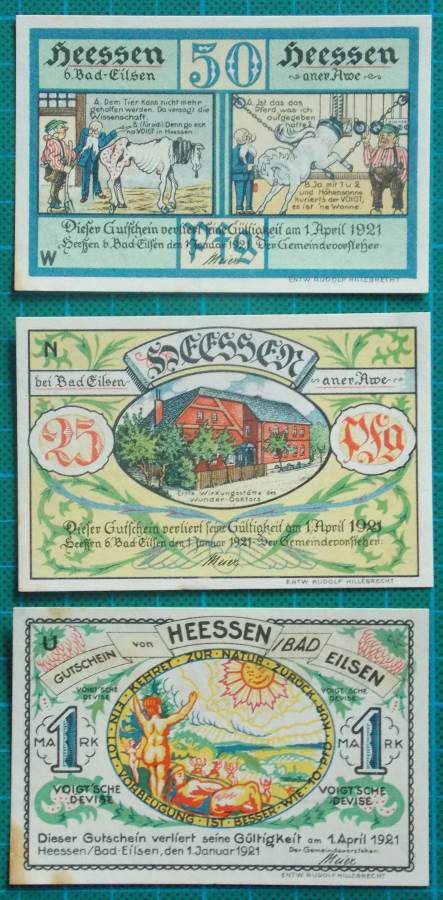 A great little triple set of notgeld banknotes from 1921 Heessen Bad Eilsen is here on offer.Â