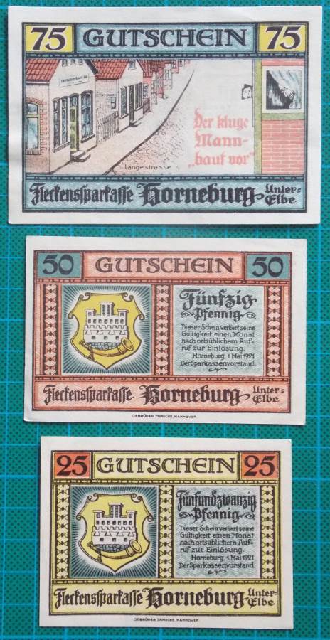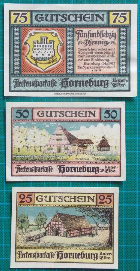 The era of hyperinflation in Germany produced many examples of emergency money or notgeld banknotes such as these lovely examples from Horneburg Unter Elbe.