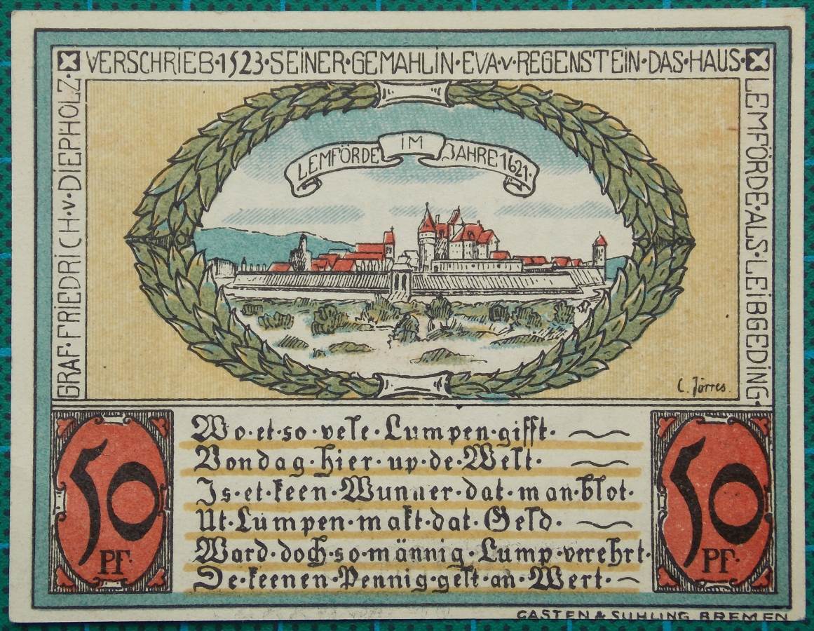 It has wonderfully historic art work with Lemförde as a town in 1621 and on the other side two knights in armour with a variety of local crests based on the Lemförd and Diepholz crests. The lion on the crests is taken from the original arms of the Count of Diepholz.
