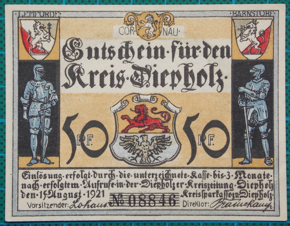 Here is a rather nice 50 Pfennig banknote issued as a credit note by the District of Diepholz in 1921.