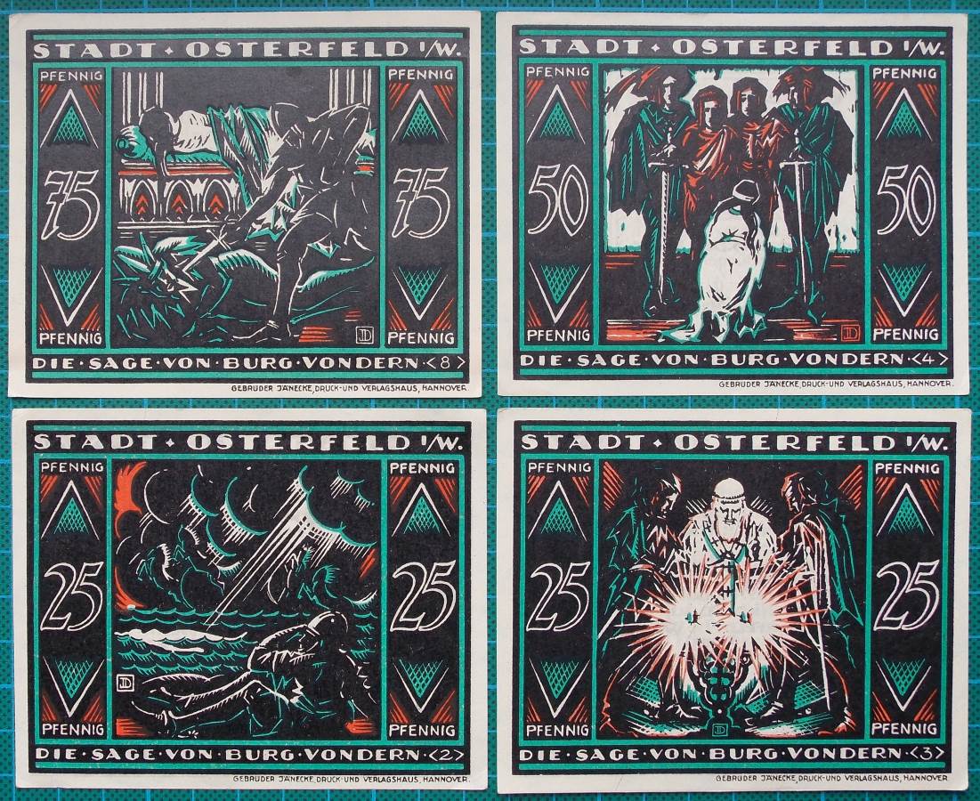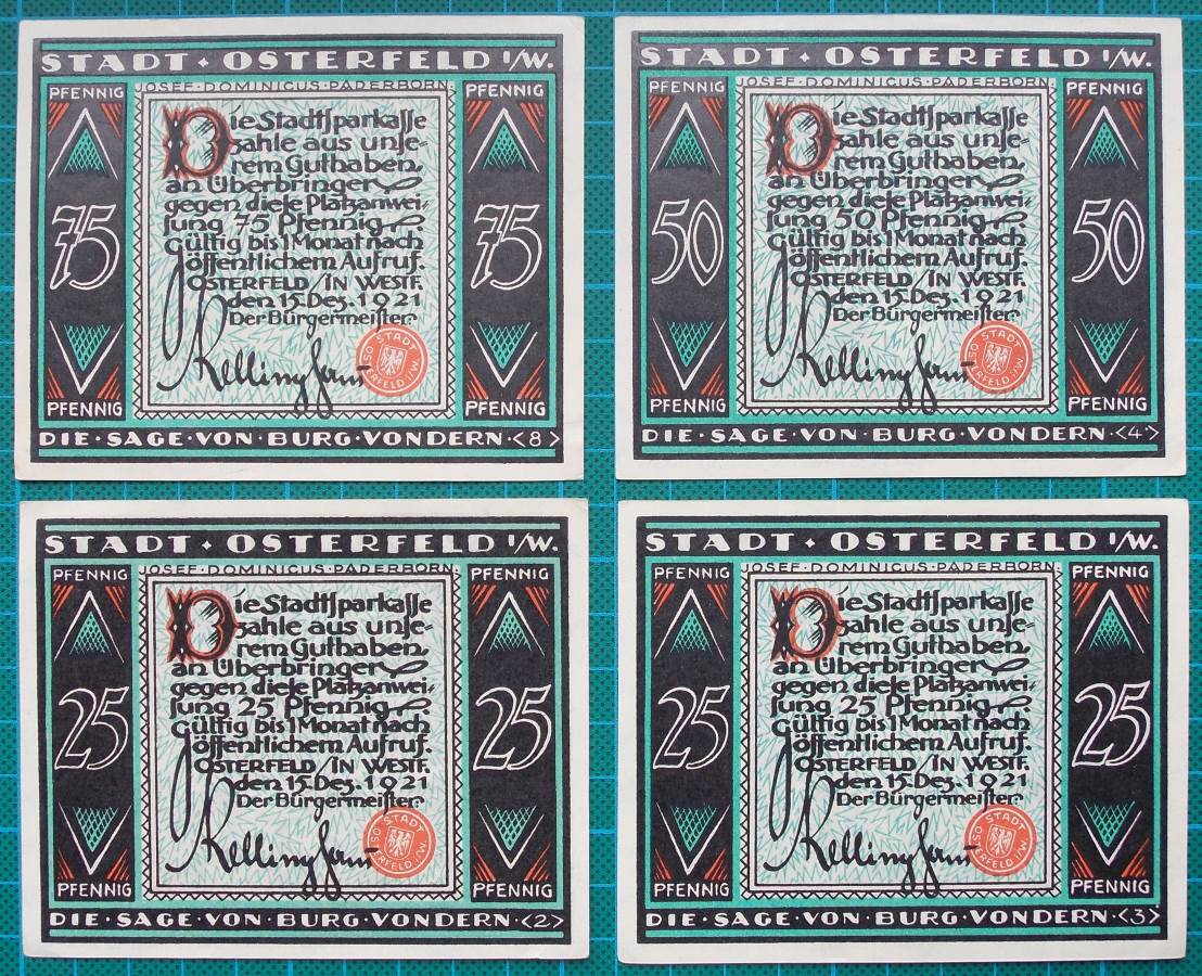 This set of emergency money notes were issued in 1921 in the district of Saxony-Anhalt in the village of Osterfeld. It is a tiny village which today numbers some 2,500 residents and covers an area of 27 sq km. In 1921 it would have been considerably smaller and as such very few of these notes would have been printed.