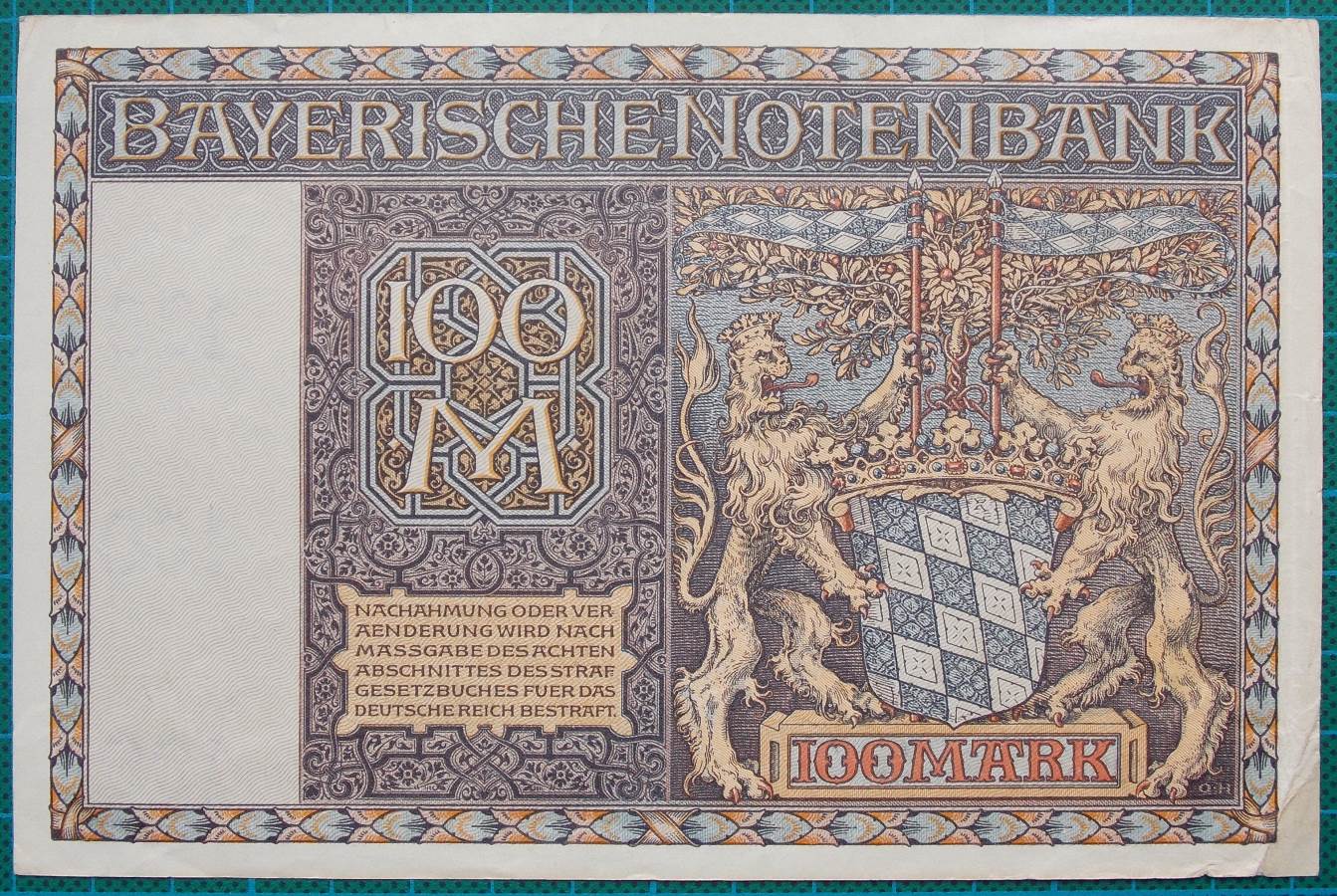 This 100 mark banknote from the Landesbank or Central Bank of Bayern has the Bayern state flag and heraldic device on the reverse with a lion supporting either side. It has the Marquee and regal crown showing the status of Bavaria has been raised to Kingdom. The inescutcheon is for the ruling house. The blue and white flag is often referred to as the lesser coat of arms of Bavaria.