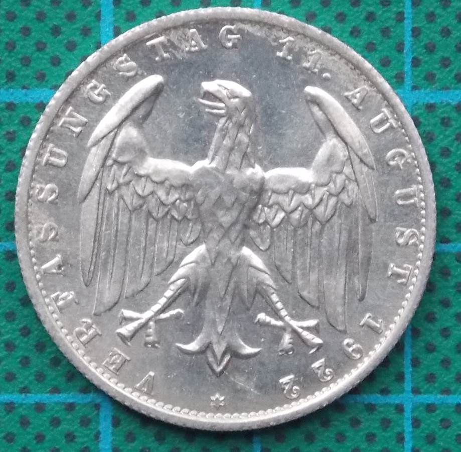 The coin was issued during the hyperinflation period a year or so before the economy collapsed. The coin has an eagle and the date commemorating the Constitution Day or in German “Verfassungstag”. Constitution day (verfassungstag) was 11 August 1919 and this coin marked the third anniversary. Some coins have the verfassungstag annotation, some do not. This one does however. In 1924 after the end of hyperinflation the coins were made in silver.