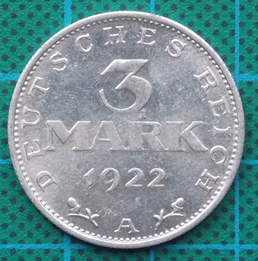 Lettering:     DEUTSCHES REICH 3 MARK 1922 –