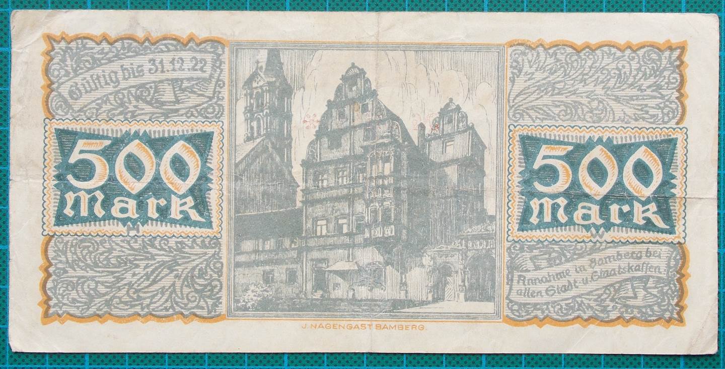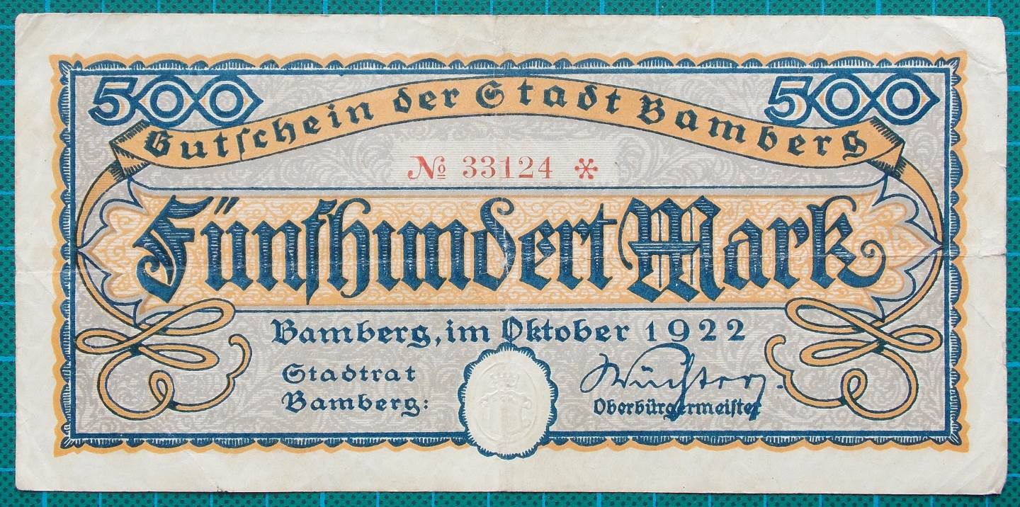 A middle grade example of this series of 500 Mark credit notes or Gütschein issued by the City of Bamberg in 1922.