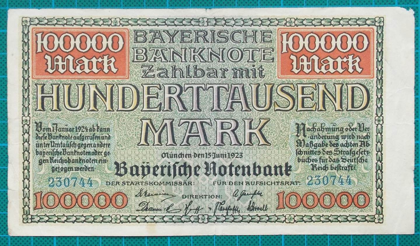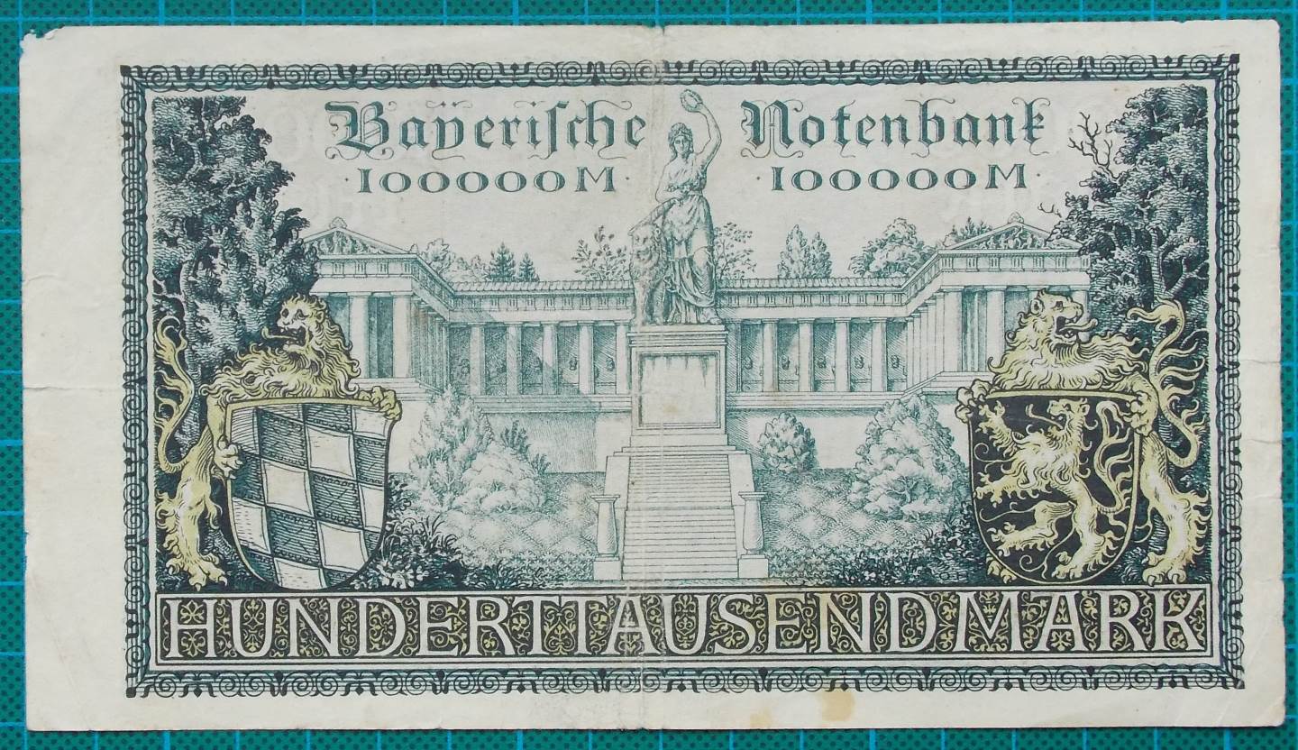 Released in 1923, it is for the value of 100,000 Mark and has some superb design work in the graphics particularly on the reverse with the Hall of Fame from Munich.
