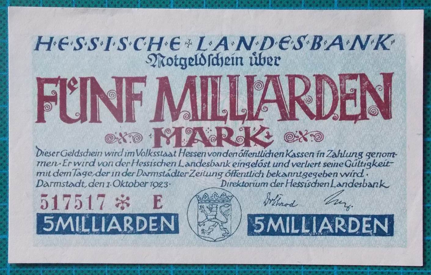 Valued at 5 Billion Mark and issued in Darmstadt in 1923 it is a big value note with a small price to you.