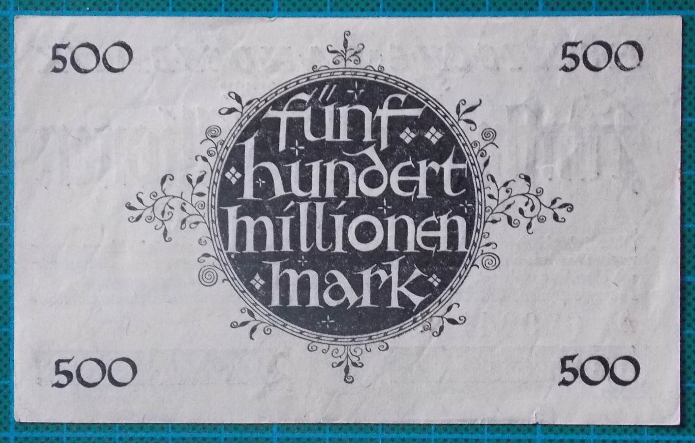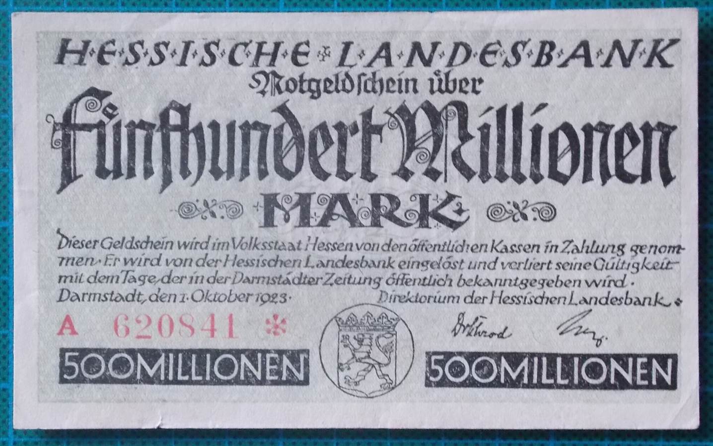 Issued by the city of Darmstadt in 1923 comes this Five Hundred Million emergency money banknote in near perfect condition.Â
