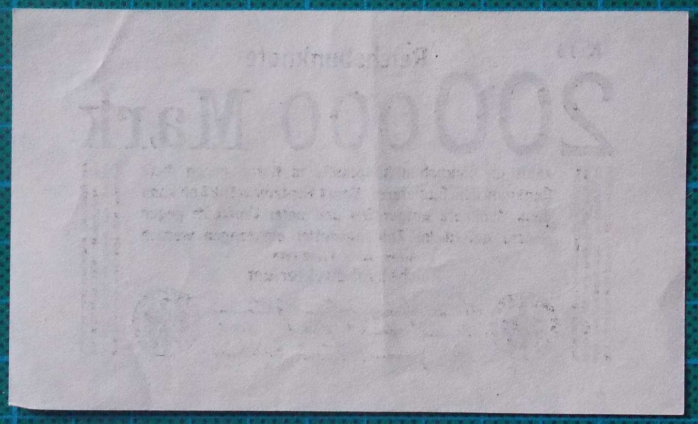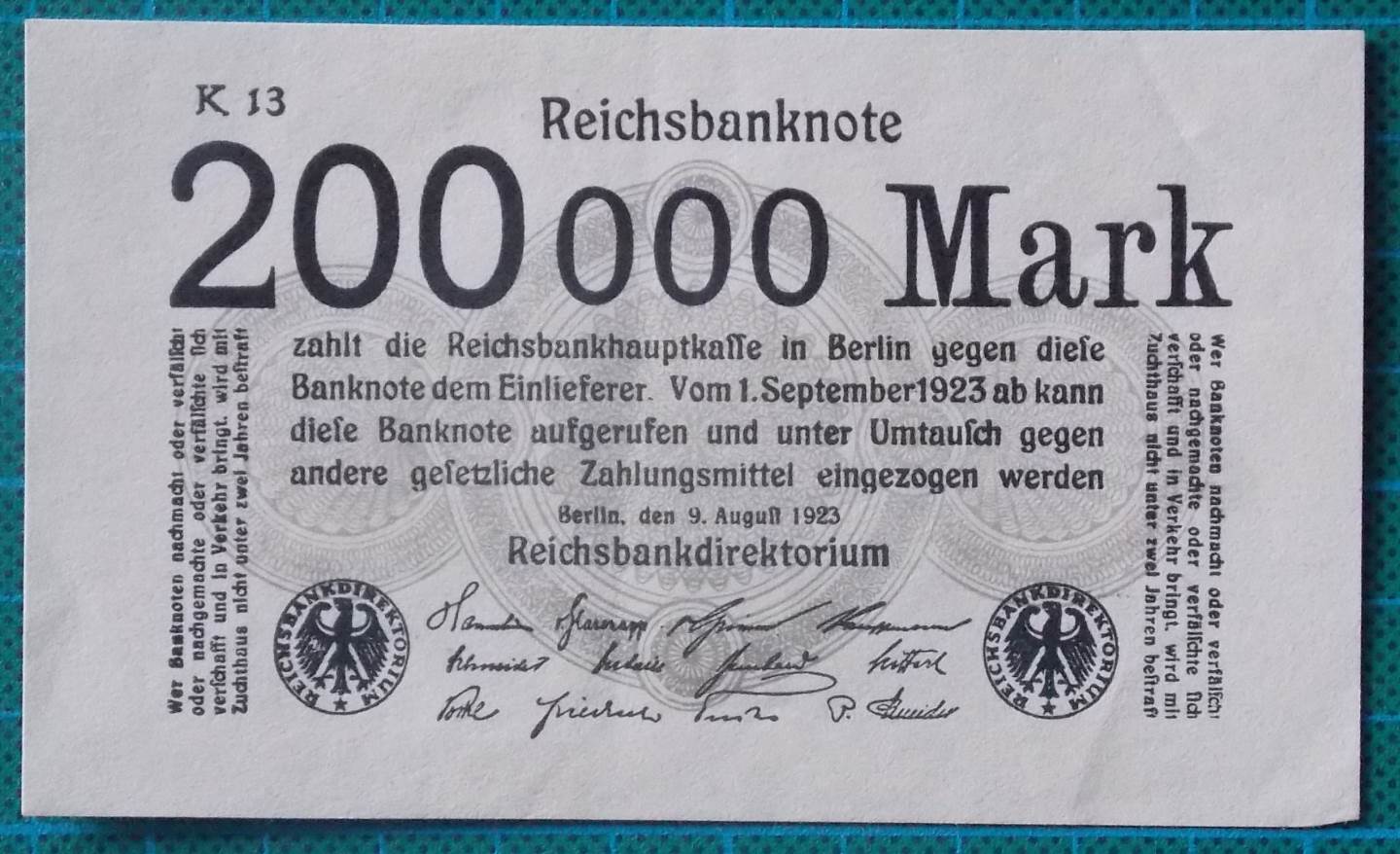 Near the end of the hyperinflation period came this 200,000 Mark banknote issued by the Reichsbankdirektorium in Berlin in late 1923.