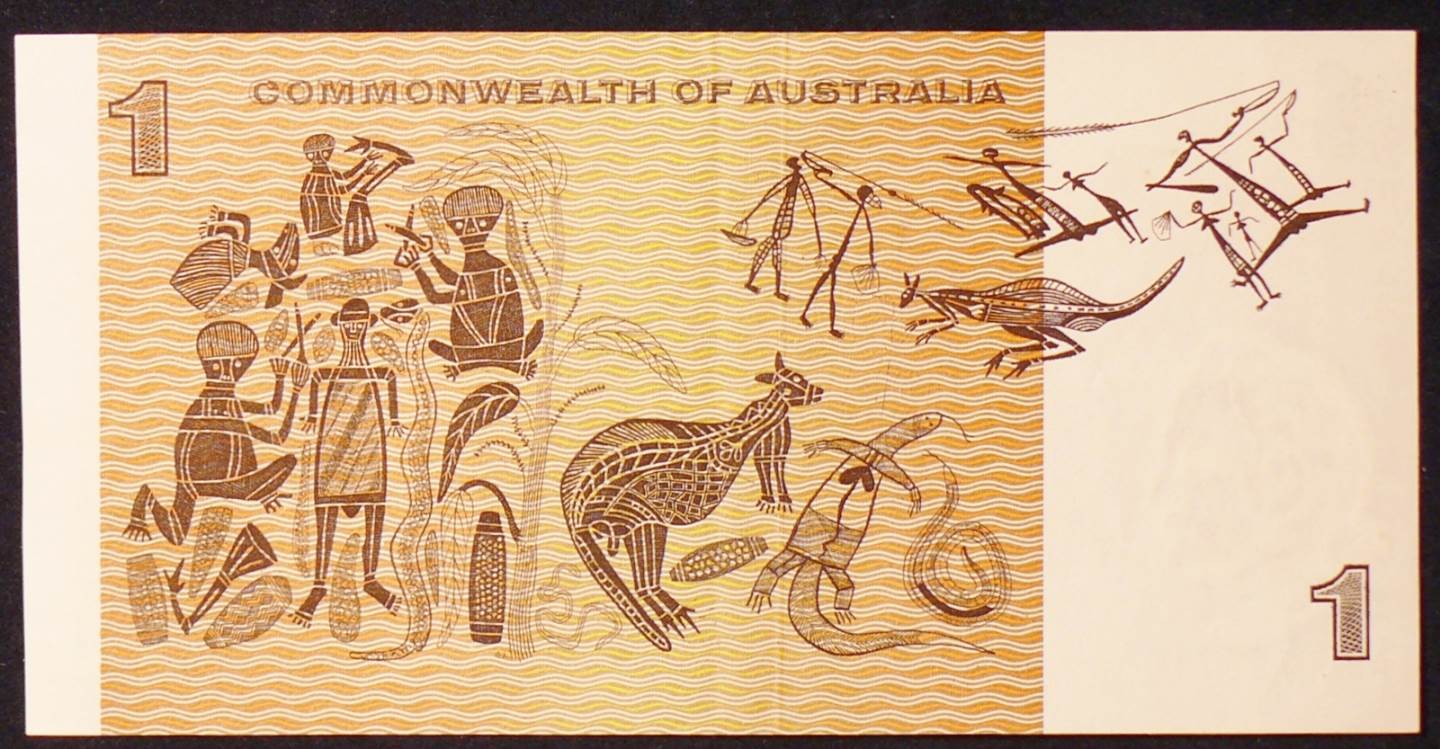 Reverse: Aboriginal Art Theme by David Malangi (1927 – 27 June 1998) was an Indigenous Australian Yolngu artist from the Northern Territory. The Yolngu (or Yol?u) are an Indigenous Australian people inhabiting north-eastern Arnhem Land in the Northern Territory of Australia. Yolngu vfwvrally means “person” in the language spoken by the people. One of the most well known bark painters from Arnhem Land. The reproduction of one of his designs was produced on the Australian one dollar note in 1966. (originally without his knowledge – when he became aware of this, he was given financial compensation). The payment by the Reserve Bank of Australia to Malangi began issues of Aboriginal copyright in Australia. He was born at Mulanga, on the east bank of the Glyde River.