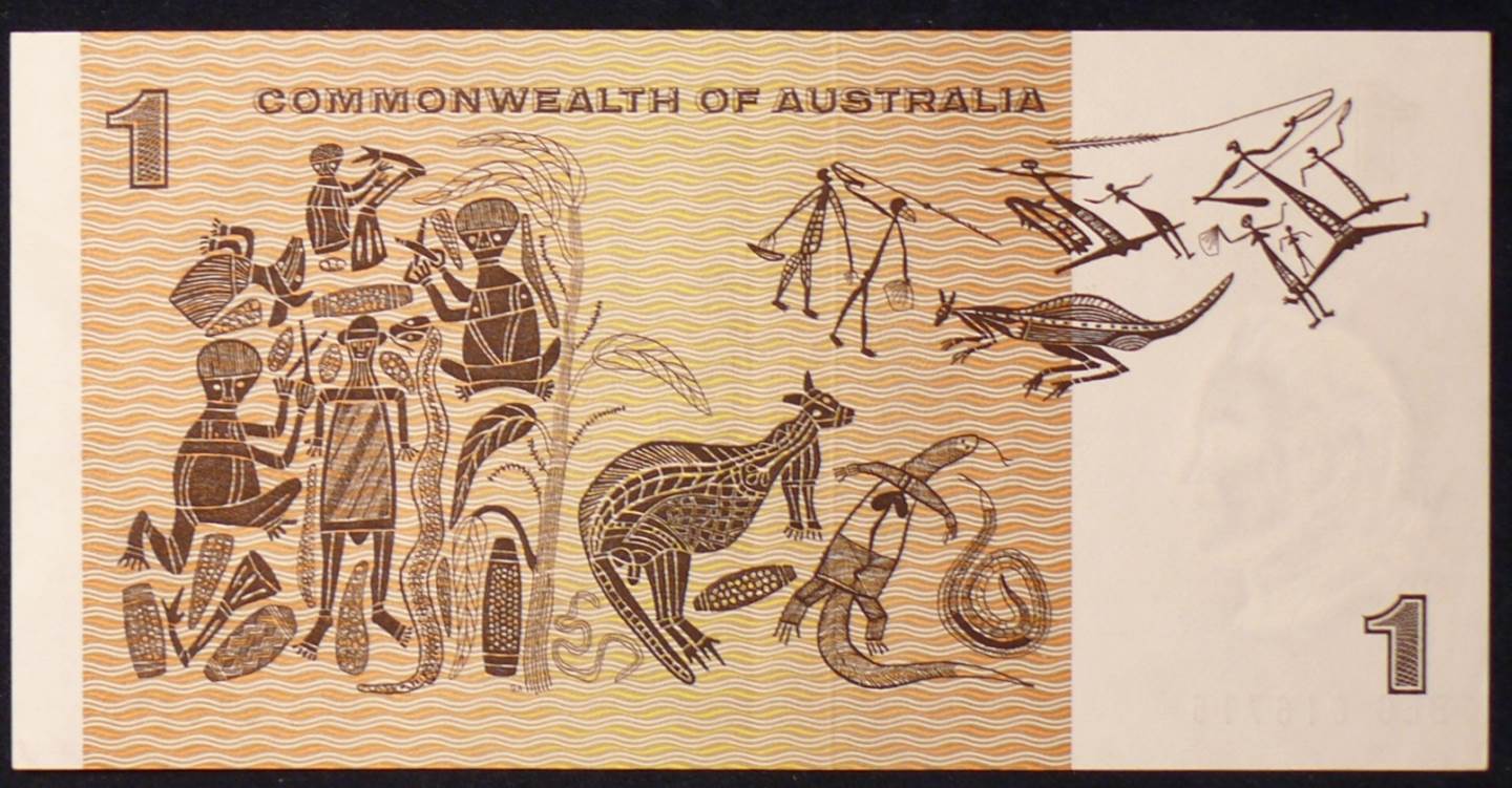 Reverse: Aboriginal Art Theme by David Malangi (1927 – 27 June 1998) was an Indigenous Australian Yolngu artist from the Northern Territory. The Yolngu (or Yol?u) are an Indigenous Australian people inhabiting north-eastern Arnhem Land in the Northern Territory of Australia. Yolngu vfwvrally means “person” in the language spoken by the people. One of the most well known bark painters from Arnhem Land. The reproduction of one of his designs was produced on the Australian one dollar note in 1966. (originally without his knowledge – when he became aware of this, he was given financial compensation). The payment by the Reserve Bank of Australia to Malangi began issues of Aboriginal copyright in Australia. He was born at Mulanga, on the east bank of the Glyde River.