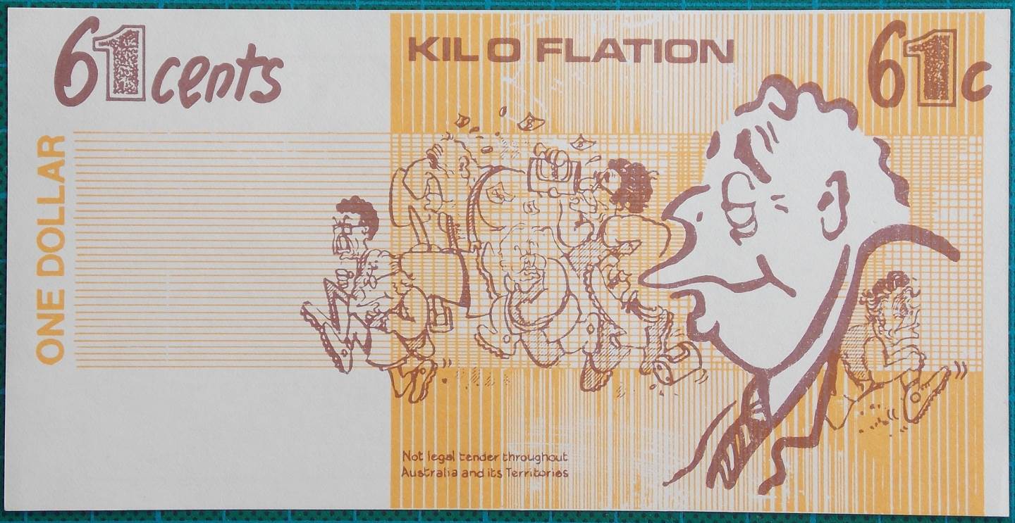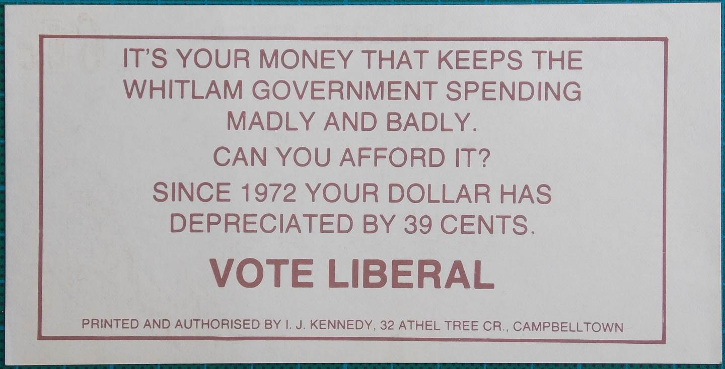 The cartoon characterization depicts Gough Whitlam and points out the devaluation of the Australian dollar during the Labour party’s term of office.