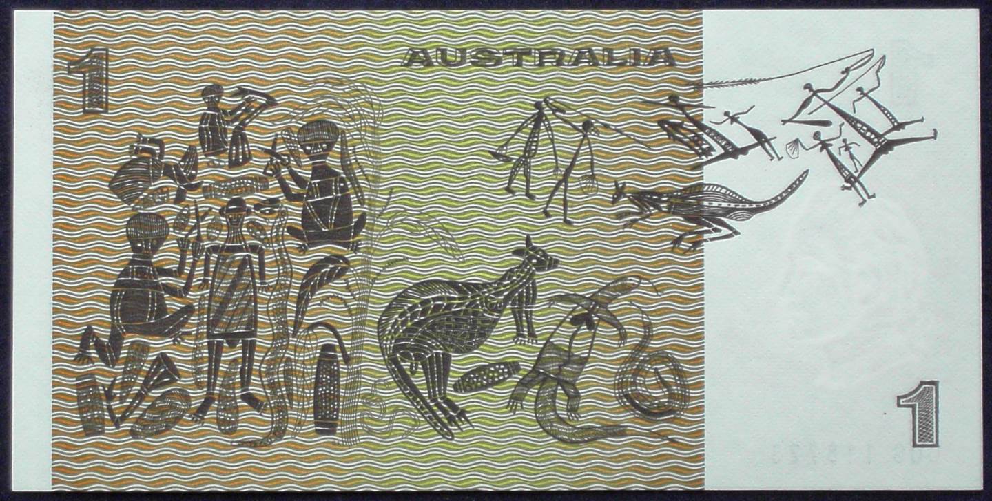 Reverse: Aboriginal Art Theme by David Malangi (1927 – 27 June 1998) was an Indigenous Australian Yolngu artist from the Northern Territory. The Yolngu (or Yol?u) are an Indigenous Australian people inhabiting north-eastern Arnhem Land in the Northern Territory of Australia. Yolngu vfwvrally means “person” in the language spoken by the people. One of the most well known bark painters from Arnhem Land. The reproduction of one of his designs was produced on the Australian one dollar note in 1966. (originally without his knowledge – when he became aware of this, he was given financial compensation). The payment by the Reserve Bank of Australia to Malangi began issues of Aboriginal copyright in Australia. He was born at Mulanga, on the east bank of the Glyde River.