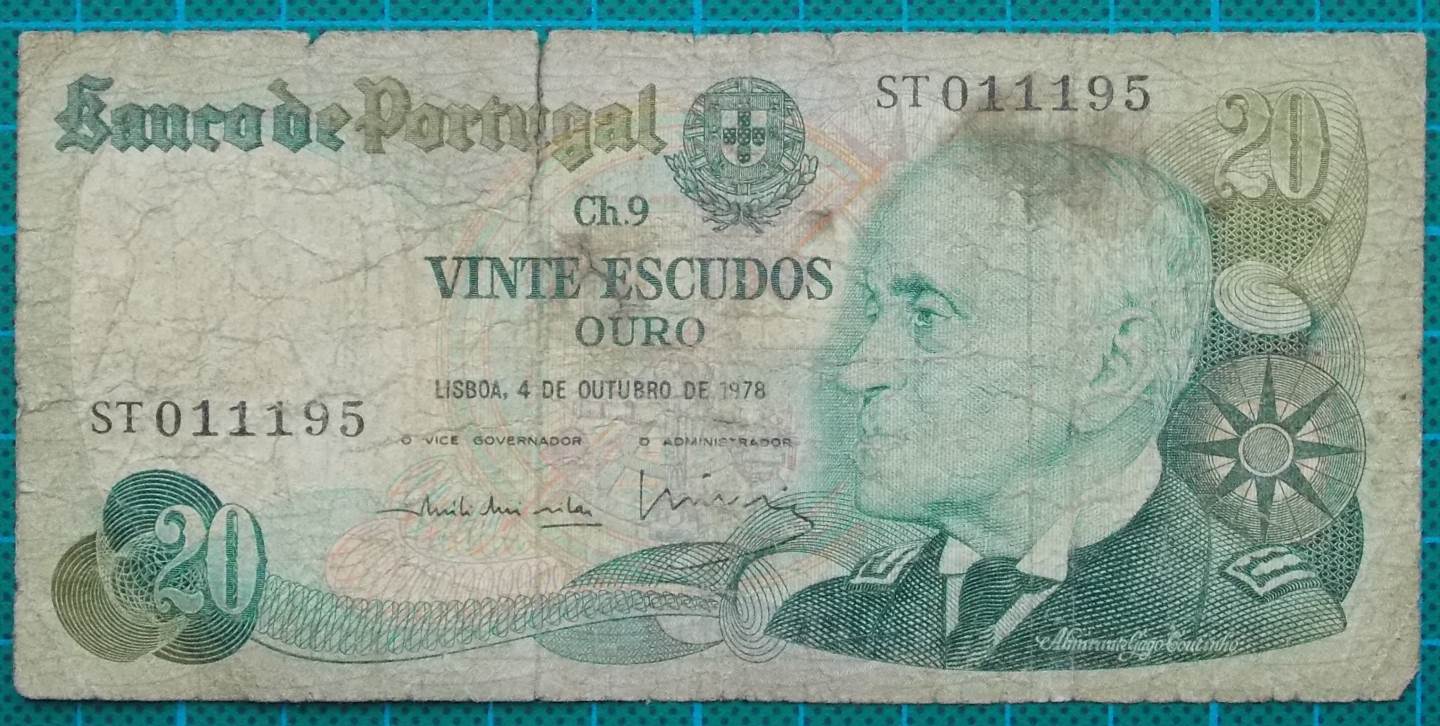 Here for sale is a 20 Escudos banknote issued by the Banco de Portugal in 1978.