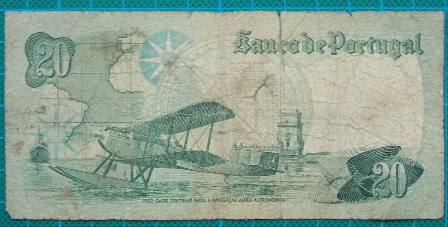 The banknote features Gago Coutinho the Portuguese aviation pioneer who made the first Atlantic crossing by plane.