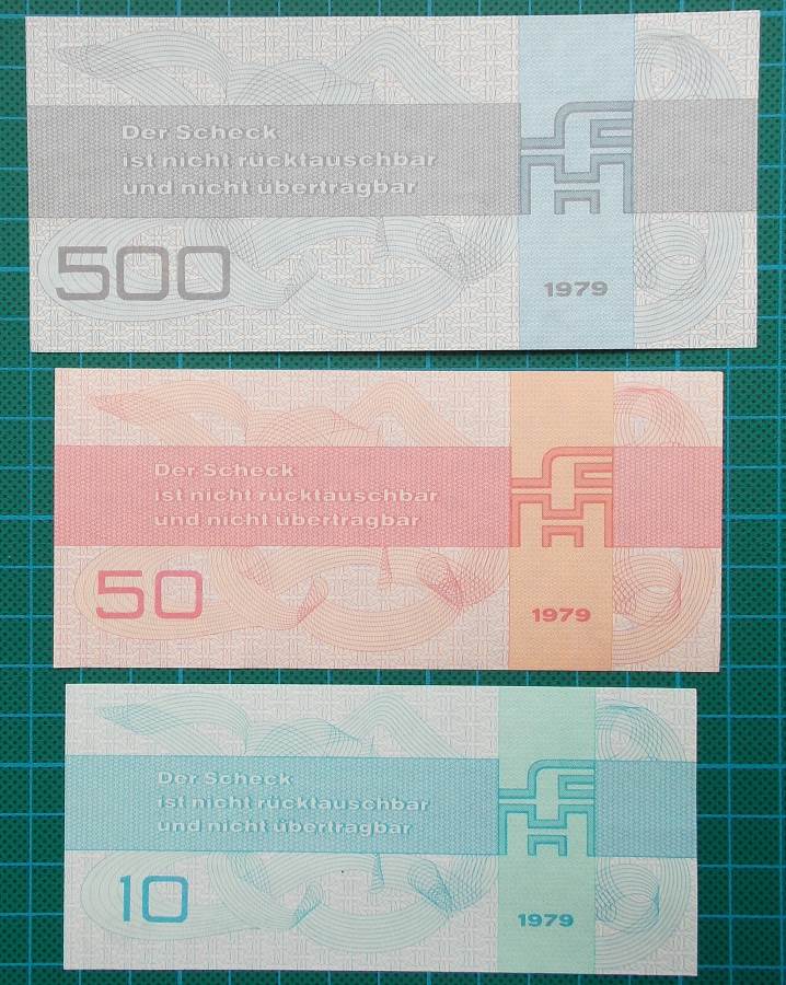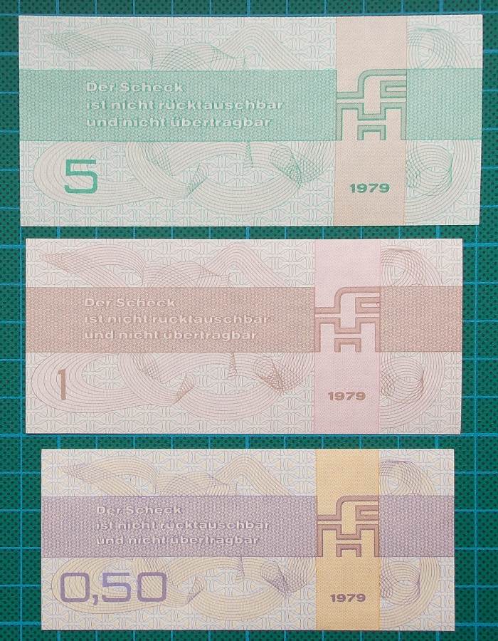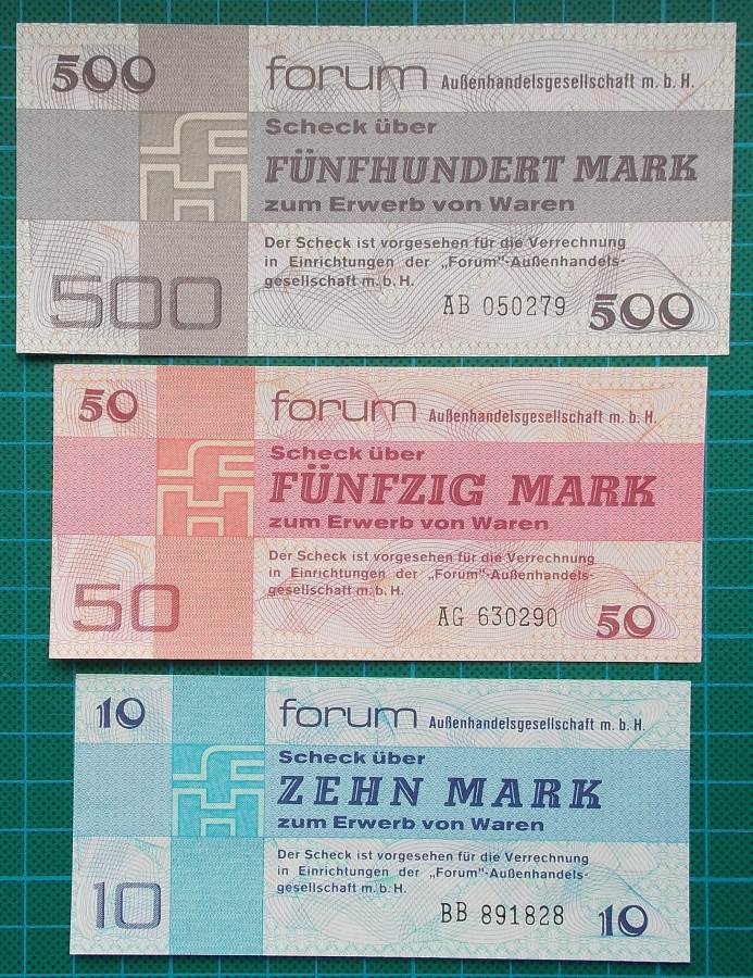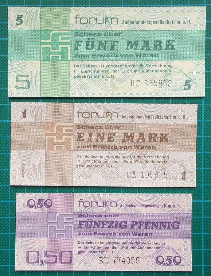 Issued within the German Democratic Republic between 1976 till 1979.  The purpose of the notes was to skim off western currencies as quickly as possible by forcing people to exchange all other currencies into this form of payment which gave the state control over purchases. Only non-citizens of the GDR could pay with cash and had to provide a passport to do so.  It was not until the mid 1980’s that direct purchases using the D-Mark was again possible by GDR citizens. A Forum cheque mark was the equivalent of a D-Mark.