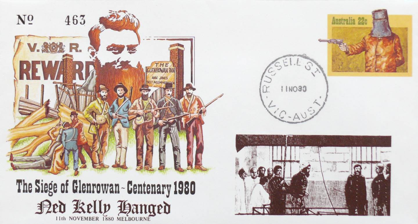 The 22-cent ‘stamp’ printed on the envelope shows Kelly ‘at bay’ wearing his armoured helmet and Colt revolver in hand.