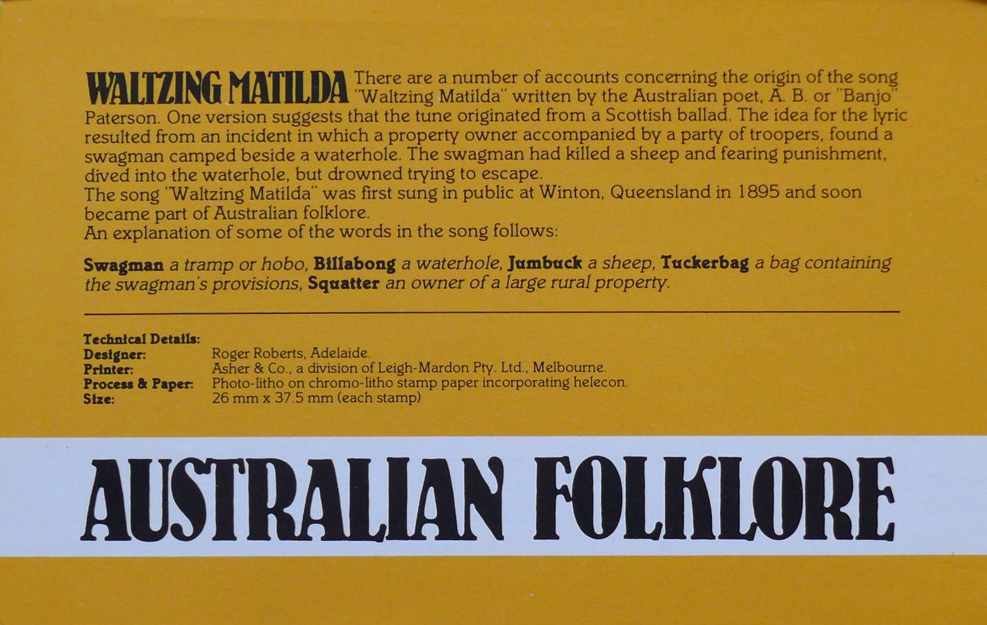 Fantastic condition. Australia’s best known ballad Waltzing Matilda is depicted in this series of mint condition stamps.