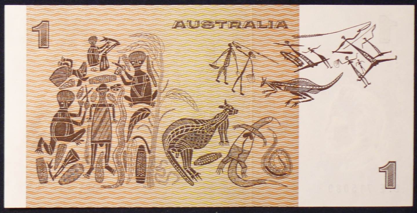 Reverse: Aboriginal Art Theme by David Malangi (1927 – 27 June 1998) was an Indigenous Australian Yolngu artist from the Northern Territory. The Yolngu (or Yol?u) are an Indigenous Australian people inhabiting north-eastern Arnhem Land in the Northern Territory of Australia. Yolngu vfwvrally means “person” in the language spoken by the people. One of the most well known bark painters from Arnhem Land. The reproduction of one of his designs was produced on the Australian one dollar note in 1966. (originally without his knowledge – when he became aware of this, he was given financial compensation). The payment by the Reserve Bank of Australia to Malangi began issues of Aboriginal copyright in Australia. He was born at Mulanga, on the east bank of the Glyde River.