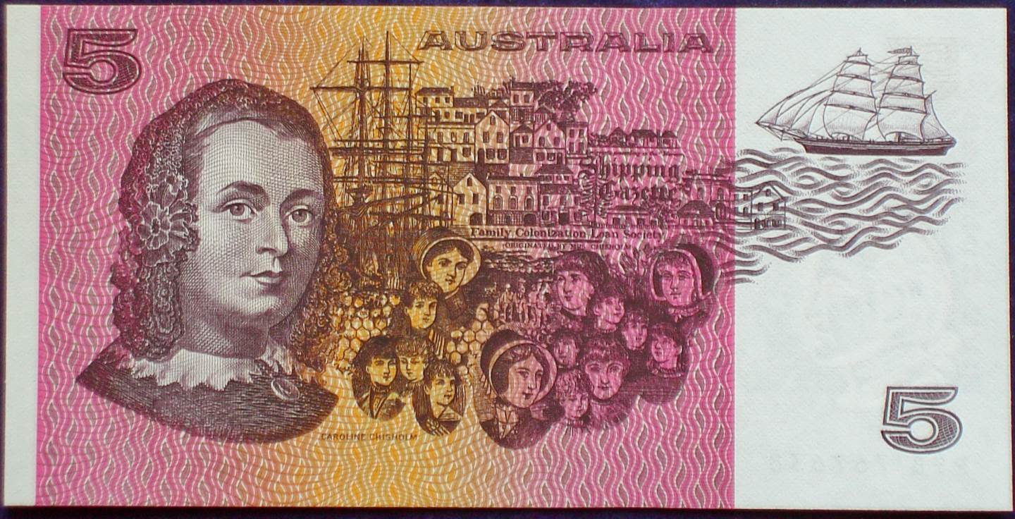 Reverse: Caroline Chisholm (30 May 1808 – 25 March 1877) was a progressive 19th-century English humanitarian known mostly for her involvement with female immigrant welfare in Australia. She is commemorated in the Calendar of saints of the Church of England. There are proposals for the Catholic Church to also recognise her as a saint, Watermark: Captain Cook in left panel Works by Joseph Banks at Project Gutenberg Australia (note, might still be copyright in other countries) Biography at the Dictionary of Canadian Biography Online Correspondence concerning Iceland: written to Sir Joseph Banks, 1772–1818, from the University of Wisconsin Digital Collections “A Bath Butterfly Botany and Eighteenth Century Sexual Politics.” National Library of Australia News 15.7 (April 2005). “New Society based in Lincolnshire, England “Bronze portrait bust of Sir Joseph Banks by Anne Seymour Damer (1814)