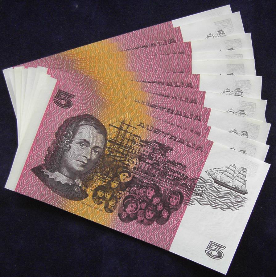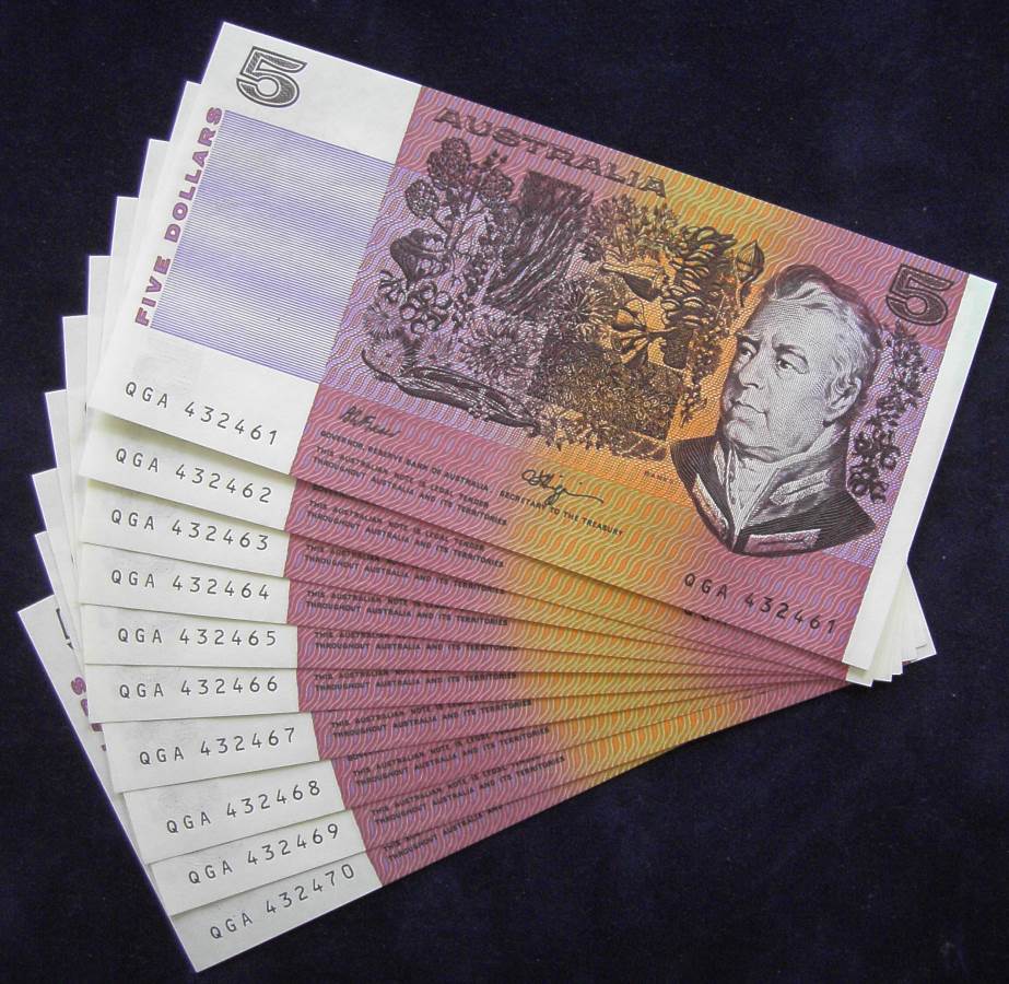 Once in a while you find something that truly is very special. On offer here are ten consecutive Fraser / Higgins five dollar paper banknotes.