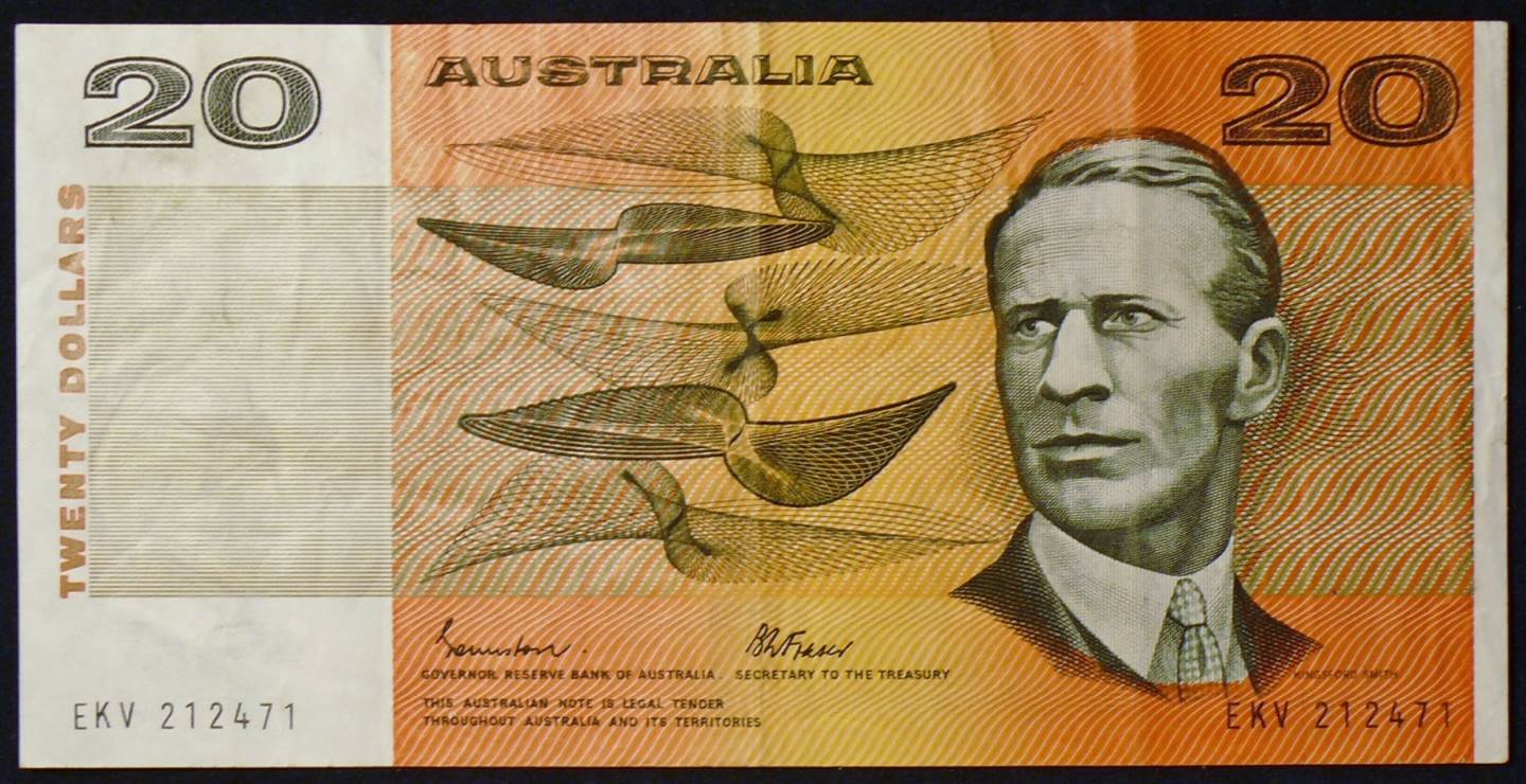 Obverse: Sir Charles Edward Kingsford Smith MC, AFC (9 February 1897 – 8 November 1935), often called Charles Kingsford Smith, or by his nickname Smithy, was a well-known early Australian aviator. In 1928, he made the first trans-Pacific flight from the United States to Australia. He also made the first non-stop crossing of the Australian mainland, the first flights between Australia and New Zealand, and the first eastward Pacific crossing from Australia to the United States. He also made a flight from Australia to London, and set a new record of 10.5 days.