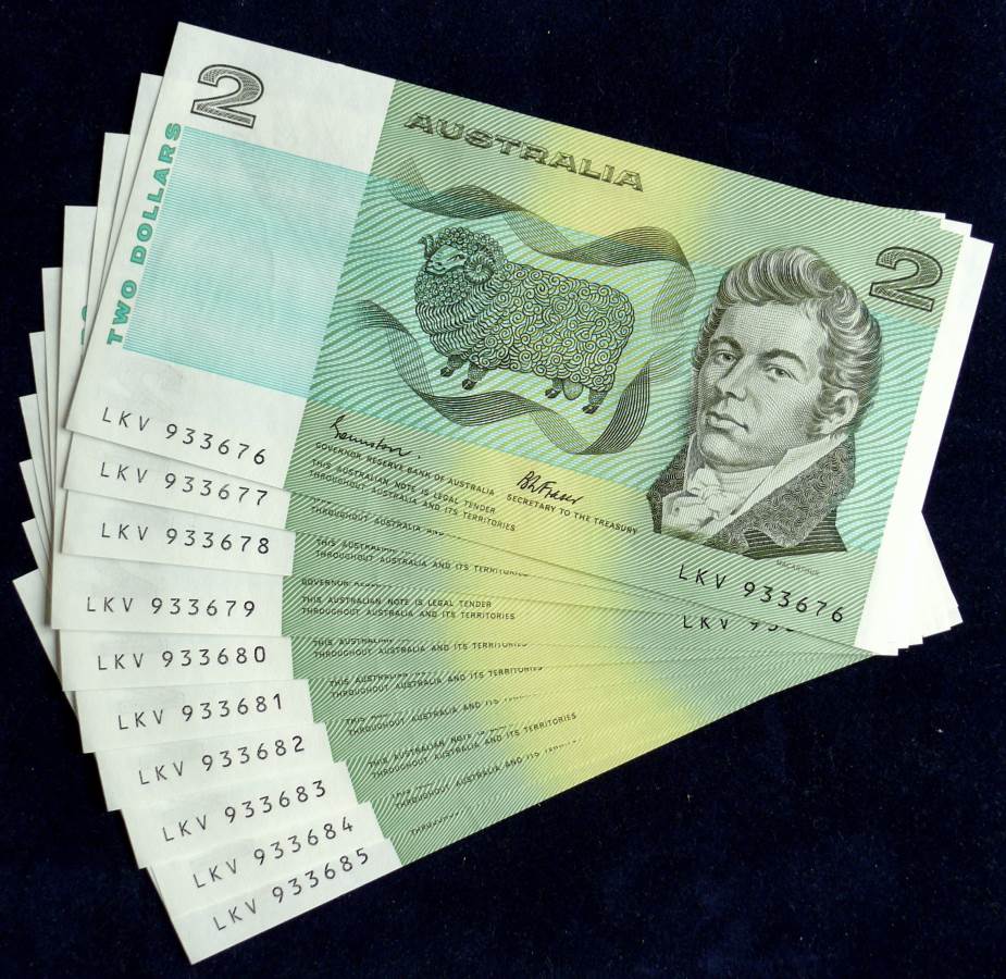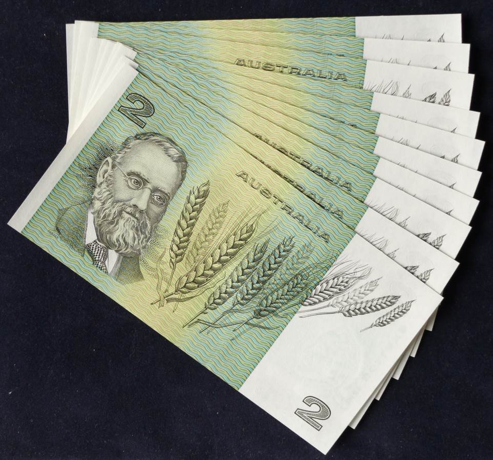 Ten consecutive Johnston / Fraser two dollar banknotes.