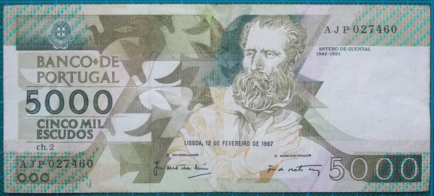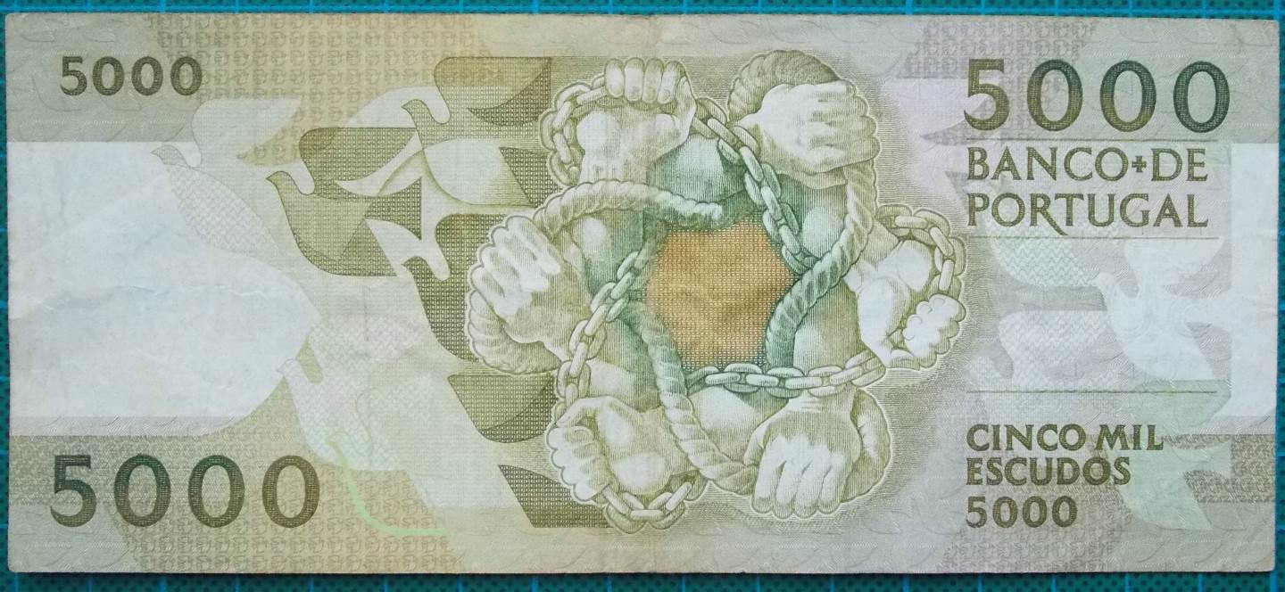 This larger denomination 5000 Escudos banknote from 1987 Portugal is in great condition.