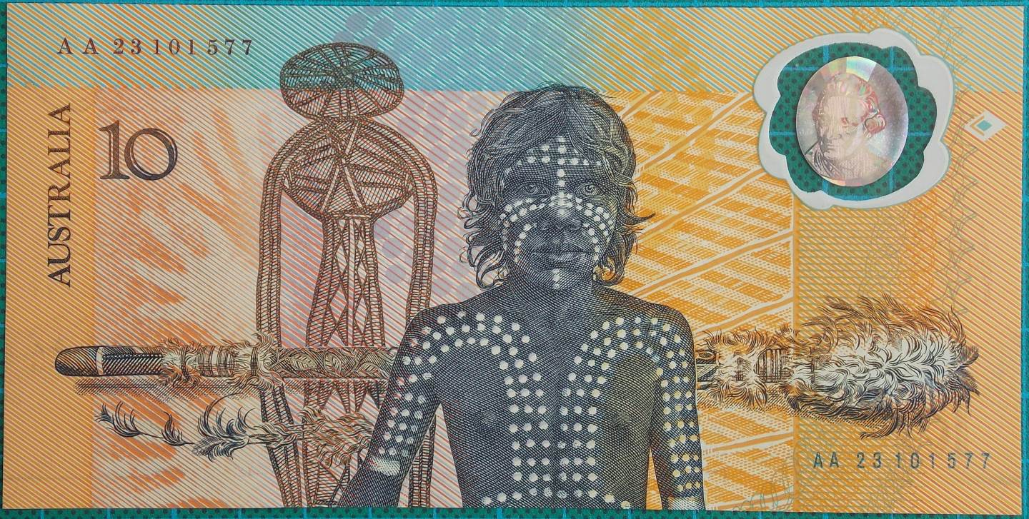 Reverse includes portraits of the native population, the main picture is a young native youth with ceremonial paint, and in the background is a Morning Star Pole, other Aboriginal artworks commissioned by the Bank and a human like figure from the Dream time.