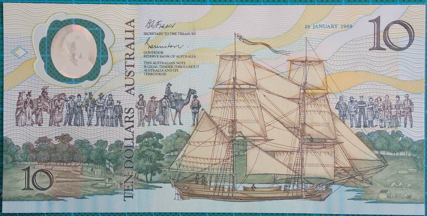 Harry Williamson, assisted by RBA staff worked to design this note. The reverse, the signature and legal tender side which was also known as the “Supply” side has the settlement theme incorporated in its design. HMS Supply was one of eleven ships, to become known as the “First Fleet,”. They sailed from Portsmouth, England, on 13th May, 1787. The fleet arrived in Botany Bay on 20 January, 1788.