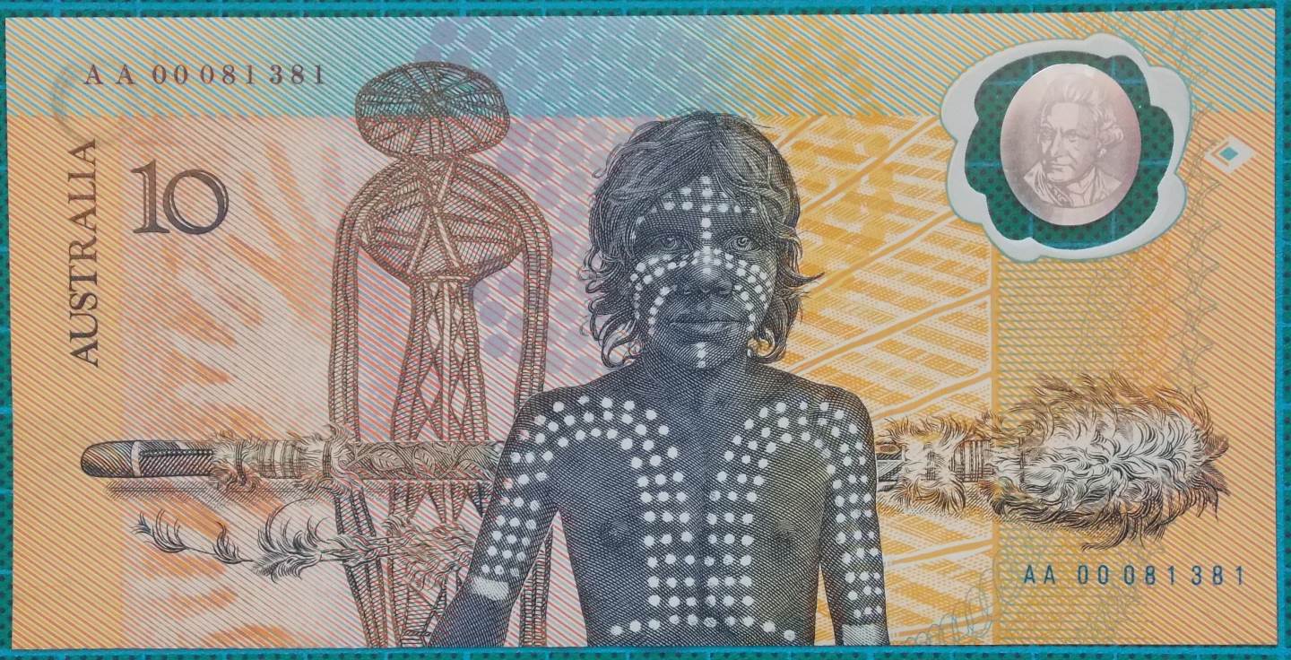 Reverse includes portraits of the native population, the main picture is a young native youth with ceremonial paint, and in the background is a Morning Star Pole, other Aboriginal artworks commissioned by the Bank and a human like figure from Dream time. W