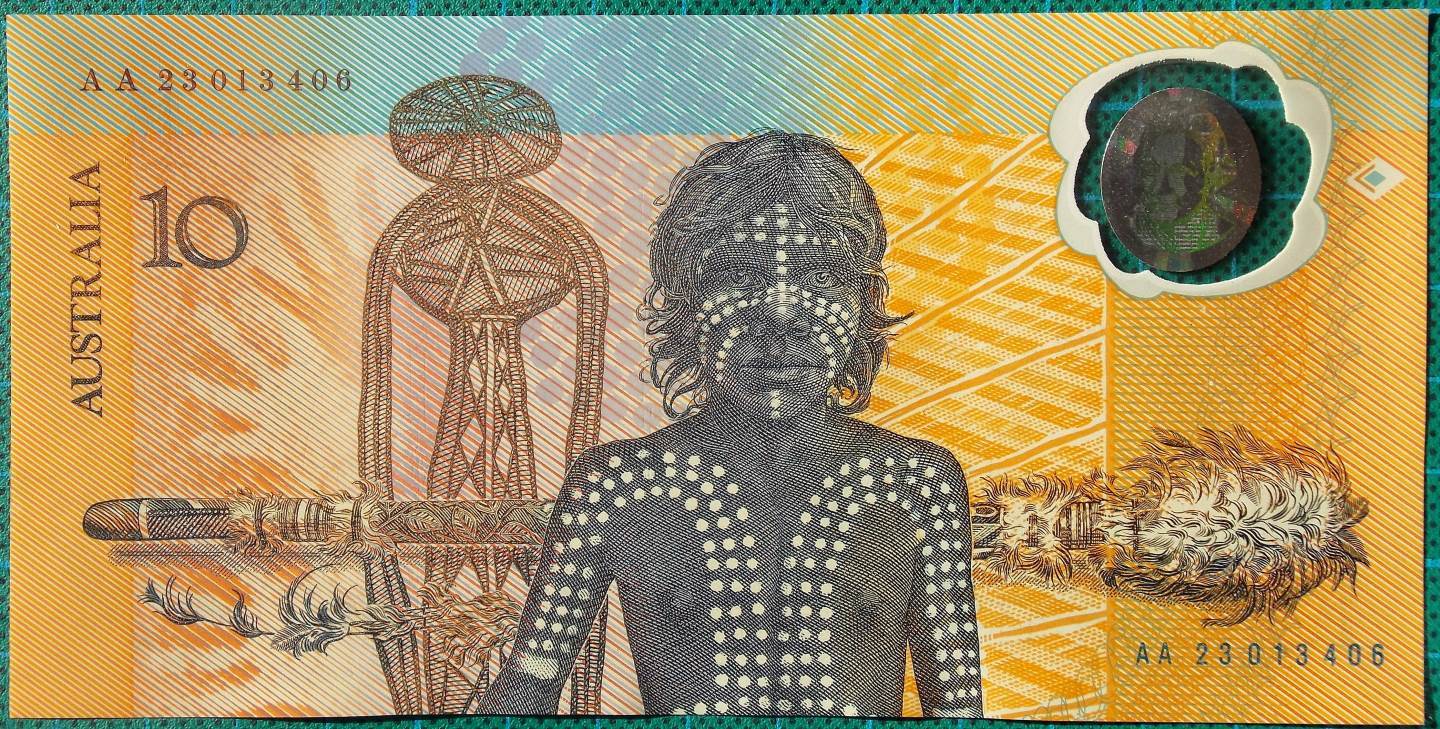 Reverse includes portraits of the native population, the main picture is a young native youth with ceremonial paint, and in the background is a Morning Star Pole, other Aboriginal artworks commissioned by the Bank and a human like figure from Dream time. W