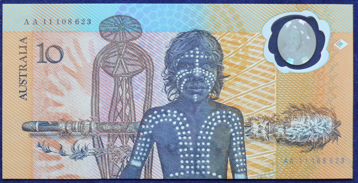 Reverse: Design includes portraits of the native population, the main picture is a young native youth with ceremonial paint, and in the background is a traditional Aboriginal Morning Star Pole also appearing are other Aboriginal artworks also commissioned by the RBA and a human like figure from the Dream Tme.Security Features:The paper design included a watermark in the white field of Captain James Cook, the watermark was also used in the last issue of pound banknotes. A metallic strip, first near the centre of the note, then from 1976 moved to the left side on the obverse of the note. Polymer issue includes a watermark or clear imprint of the coat of arms which is printed over. A raised image in the clear panel of wavy lines. Also for this issue fluorescent colouring was added to the serial numbers. A star with four points on the obverse and three on the reverse which join under light. Raised print and micro printing of the denomination name are included. The 1988 Commemorative note was the first issue to include a optically variable device of Captain James Cook who first mapped Botany Bay.
