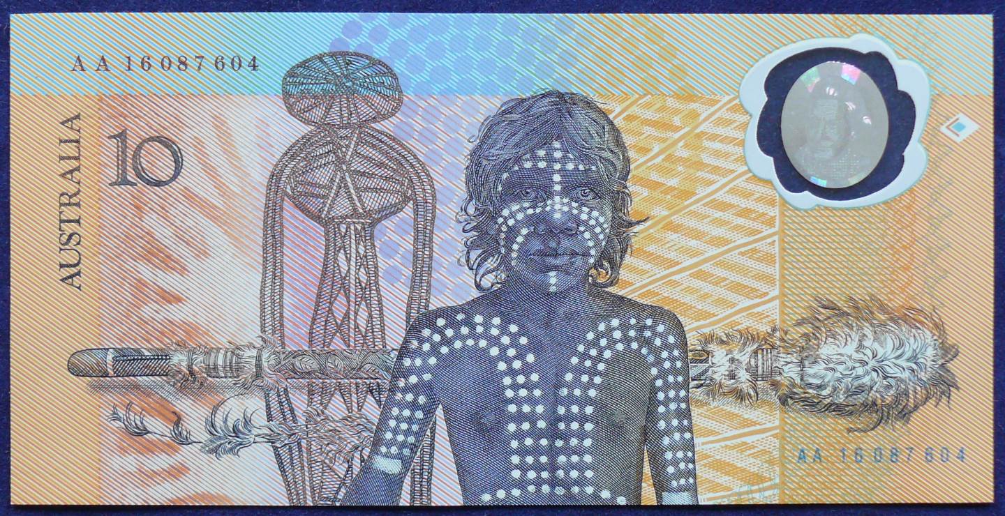 Reverse:Â includes portraits of the native population, the main picture is a young native youth with ceremonial paint, and in the background is a traditional Aboriginal Morning Star Pole also appearing are other Aboriginal artworks also commissioned by the RBA and a human like figure from the Dream Time.