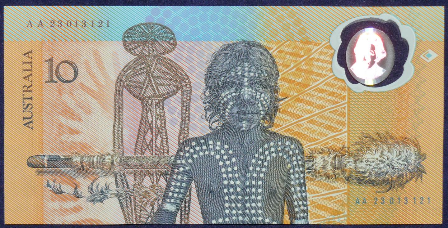Reverse includes portraits of the native population, the main picture is a young native youth with ceremonial paint, and in the background is a Morning Star Pole, other Aboriginal artworks commissioned by the Bank and a human like figure from the Dream time.