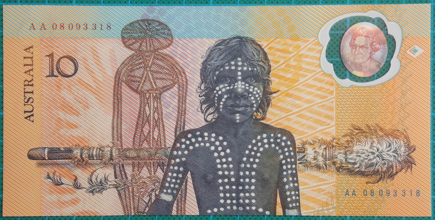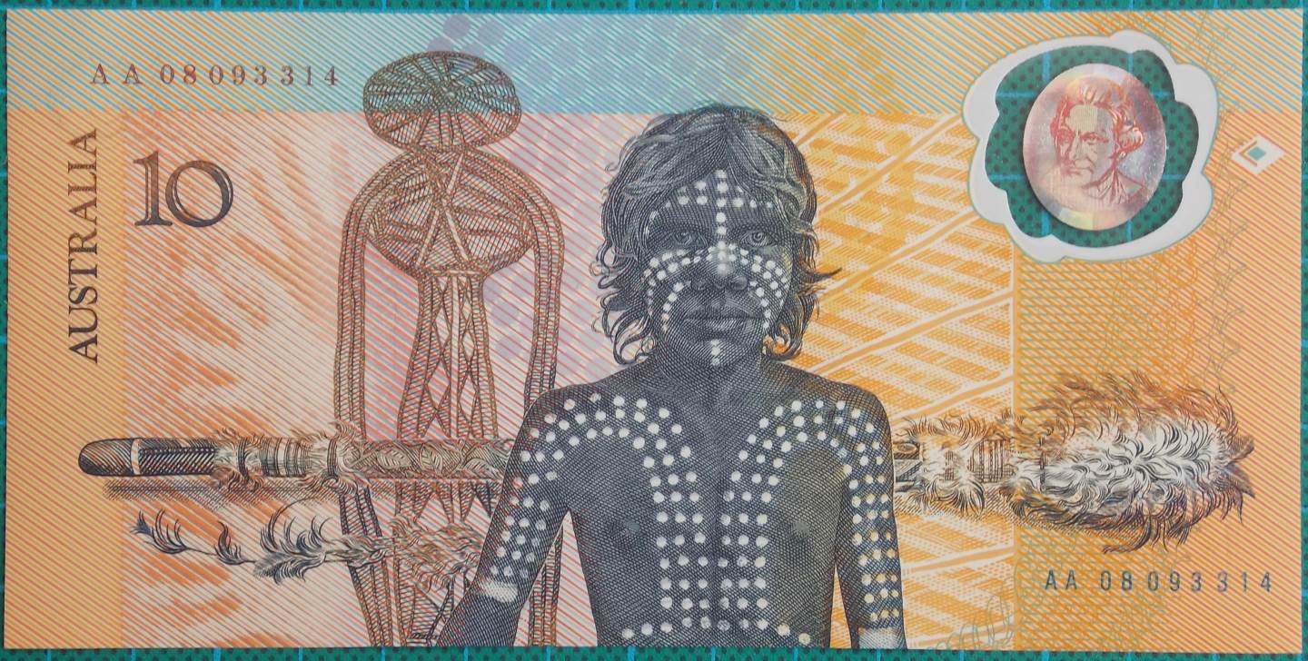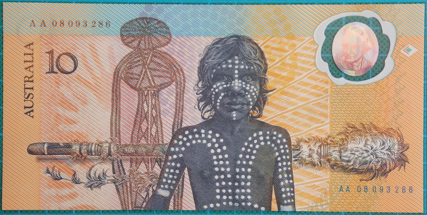 Reverse includes portraits of the native population, the main picture is a young native youth with ceremonial paint, and in the background is a traditional Aboriginal Morning Star Pole also appearing are other Aboriginal artworks also commissioned by the RBA and a human like figure from the Dream Tme.