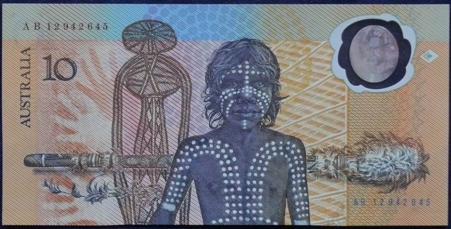 Reverse:Reverse includes portraits of the native population, the main picture is a young native youth with ceremonial paint, and in the background is a traditional Aboriginal Morning Star Pole also appearing are other Aboriginal artworks also commissioned by the RBA and a human like figure from the Dream Time.