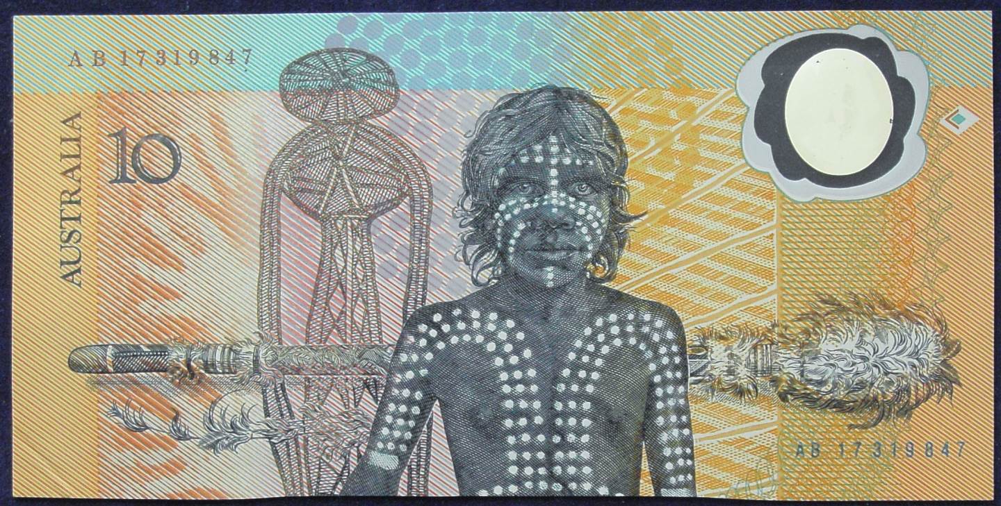 Reverse:Reverse includes portraits of the native population, the main picture is a young native youth with ceremonial paint, and in the background is a traditional Aboriginal Morning Star Pole also appearing are other Aboriginal artworks also commissioned by the RBA and a human like figure from the Dream Time.