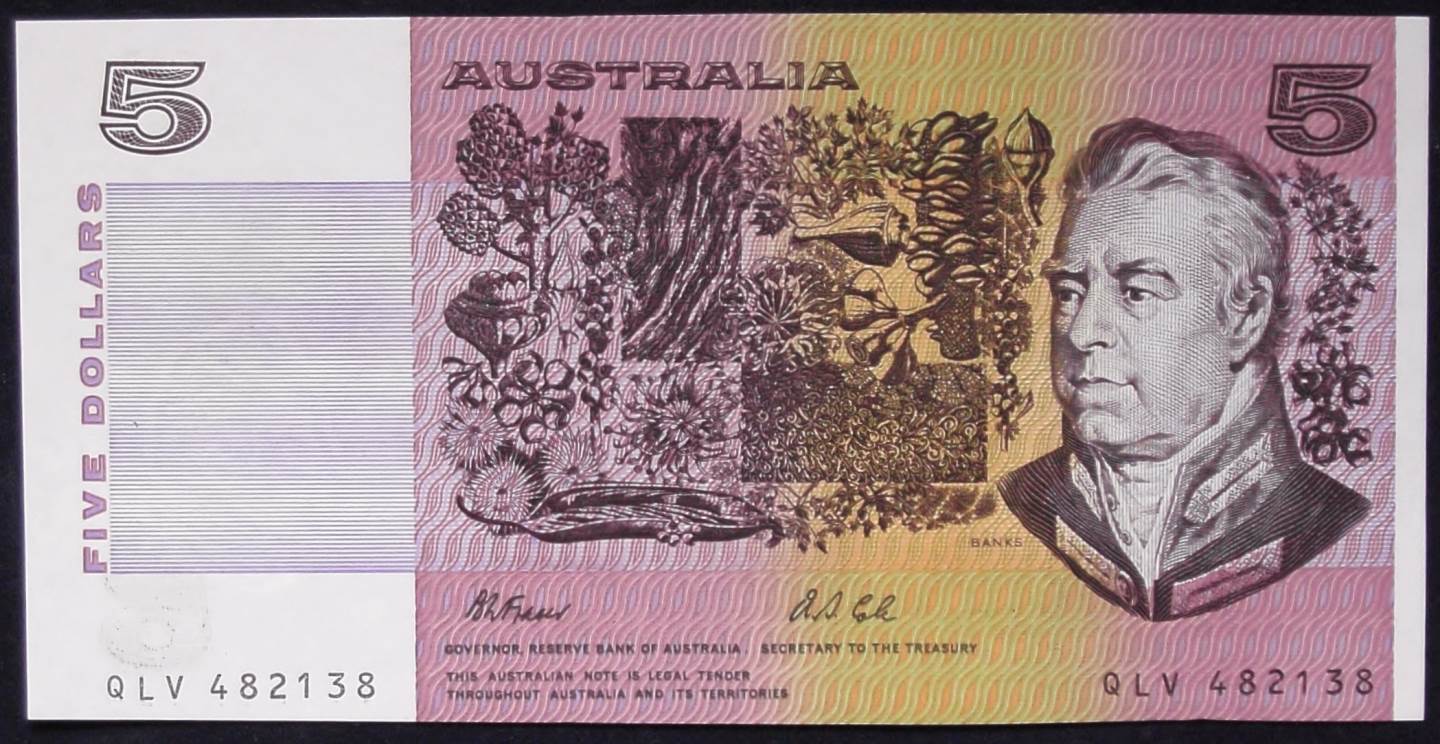 A bank note from the final year of paper Five Dollar banknotes.