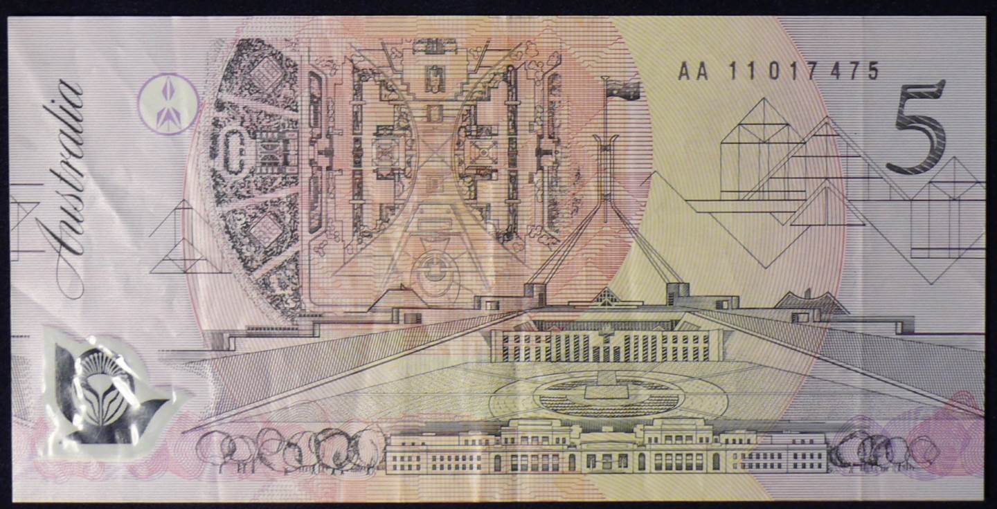 Reverse:Old and New Parliament House, Capital Hill, Canberra. Parliament House is the meeting place of the Parliament of Australia. It is located in Canberra, the capital of Australia. It was opened on 9 May 1988 by Queen Elizabeth II, Queen of Australia. Its construction cost was over $1.1 billion. At the time of its construction it was the most expensive building in the Southern Hemisphere. Prior to 1988, the Parliament of Australia met in the Provisional Parliament House, which is now known as “Old Parliament House”.Watermark:With the introduction of the new polymer banknotes we saw the end of the customary watermark. It was replaced with a Variable Optical Security Device in the bottom corner.