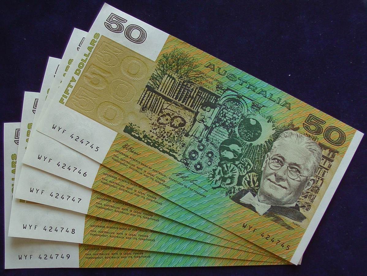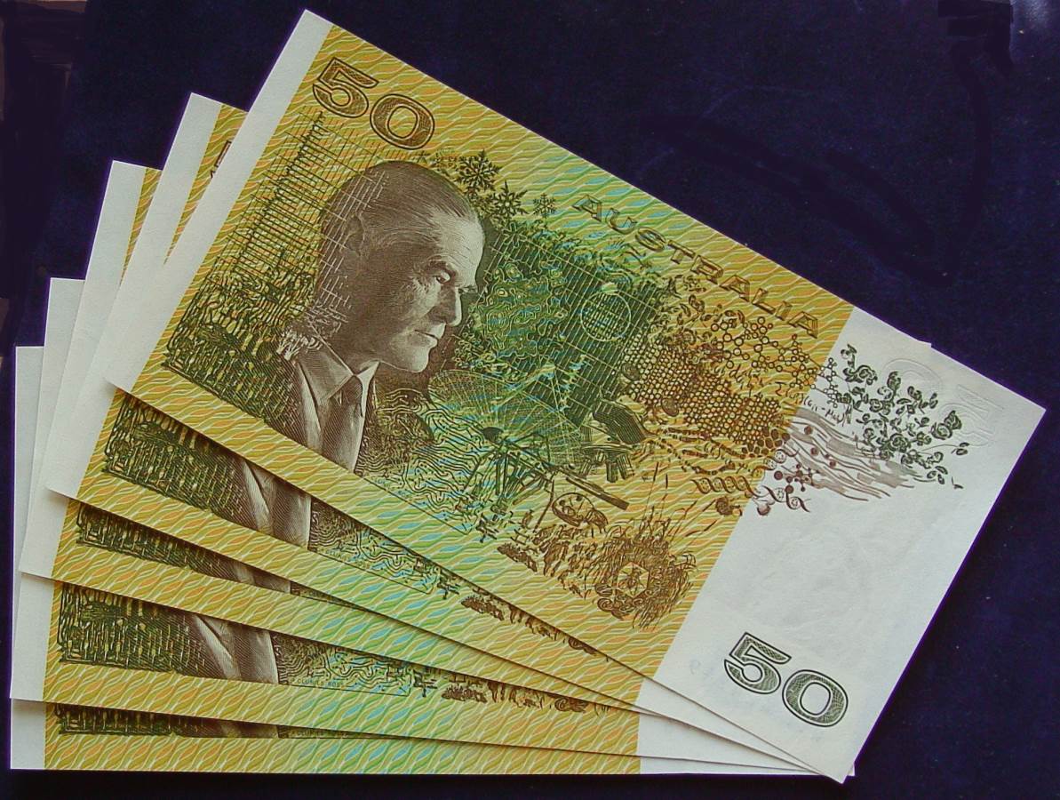 Reverse: Sir (William) Ian Clunies Ross, CMG (1899–1959) is described as the ‘architect’ of Australia’s scientific boom, for his stewardship of Australia’s scientific organisation the Commonwealth Scientific and Industrial Research Organisation – CSIRO. Fifty Dollars