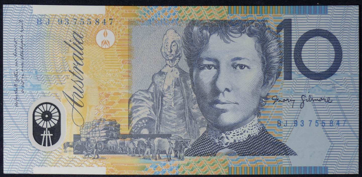 4. Slightly raised printing (intaglio) can be felt with your fingers, this is used on selected parts of the design such as the portraits of Dame Mary Gilmore and Banjo Paterson, the word Australia and the numeral 10.