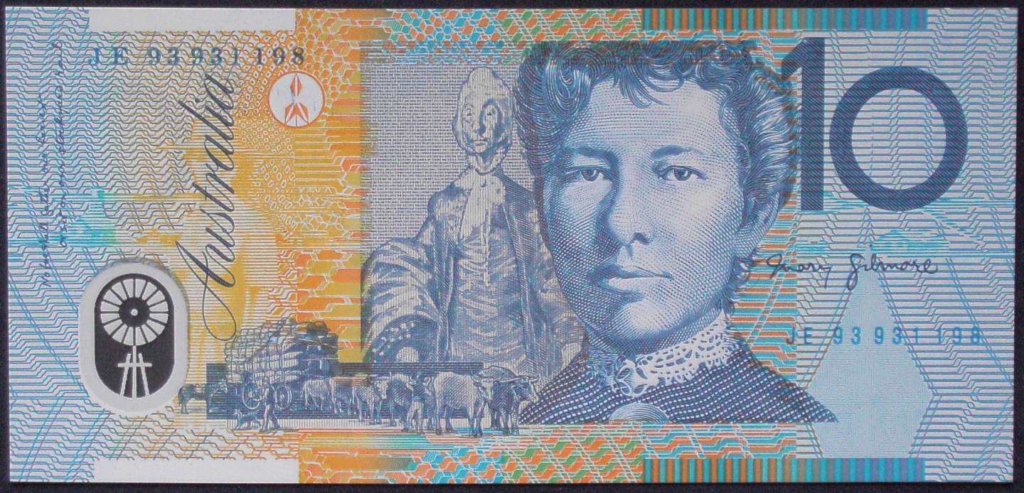 4. Slightly raised printing (intaglio) can be felt with your fingers, this is used on selected parts of the design such as the portraits of Dame Mary Gilmore and Banjo Paterson, the word Australia and the numeral 10.